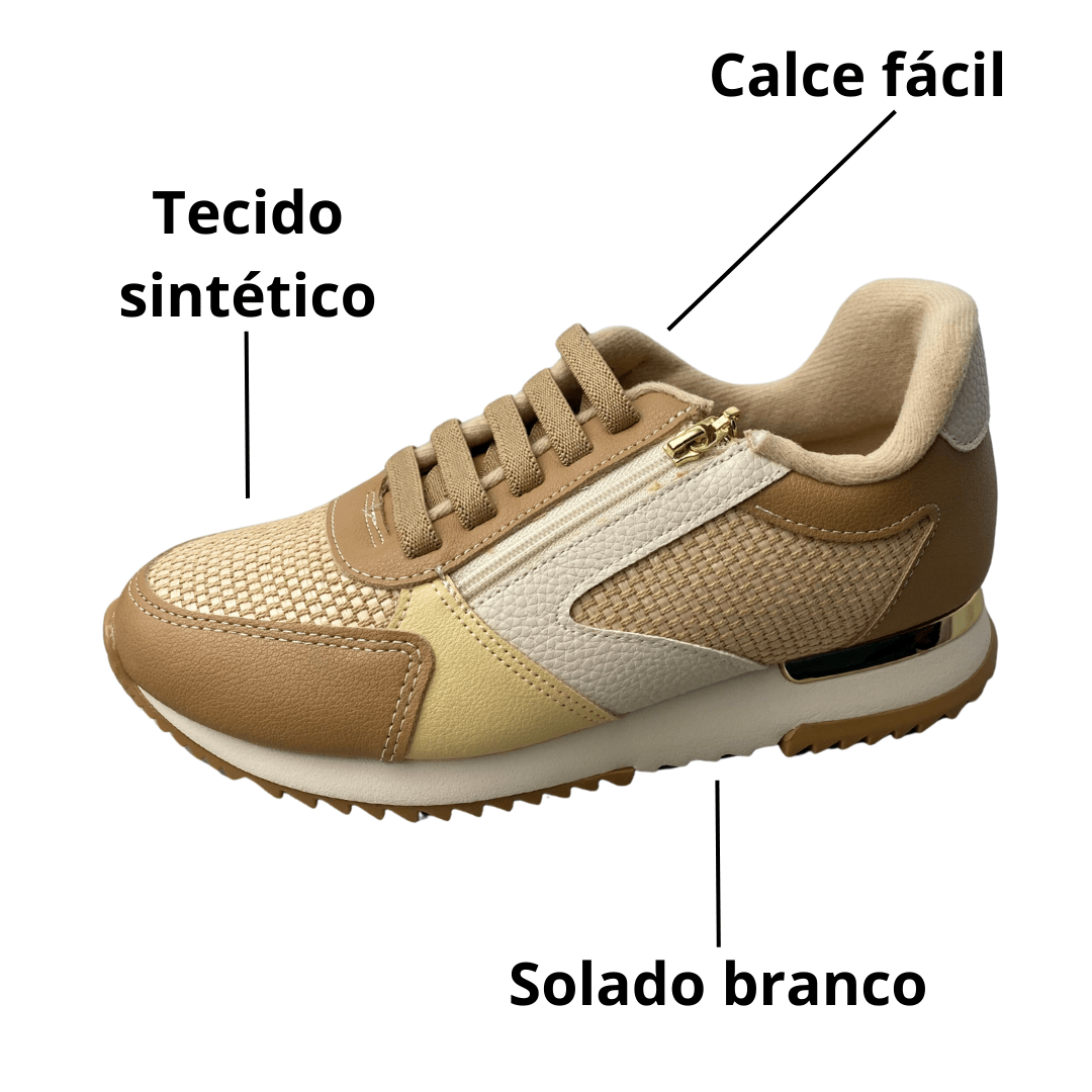 Abra o zíper lateral, calce o tênis e ajuste o cadarço na primeira vez de uso. Depois, use apenas o zíper para colocar e retirar, mantendo sempre o ajuste ideal para seus pés.
