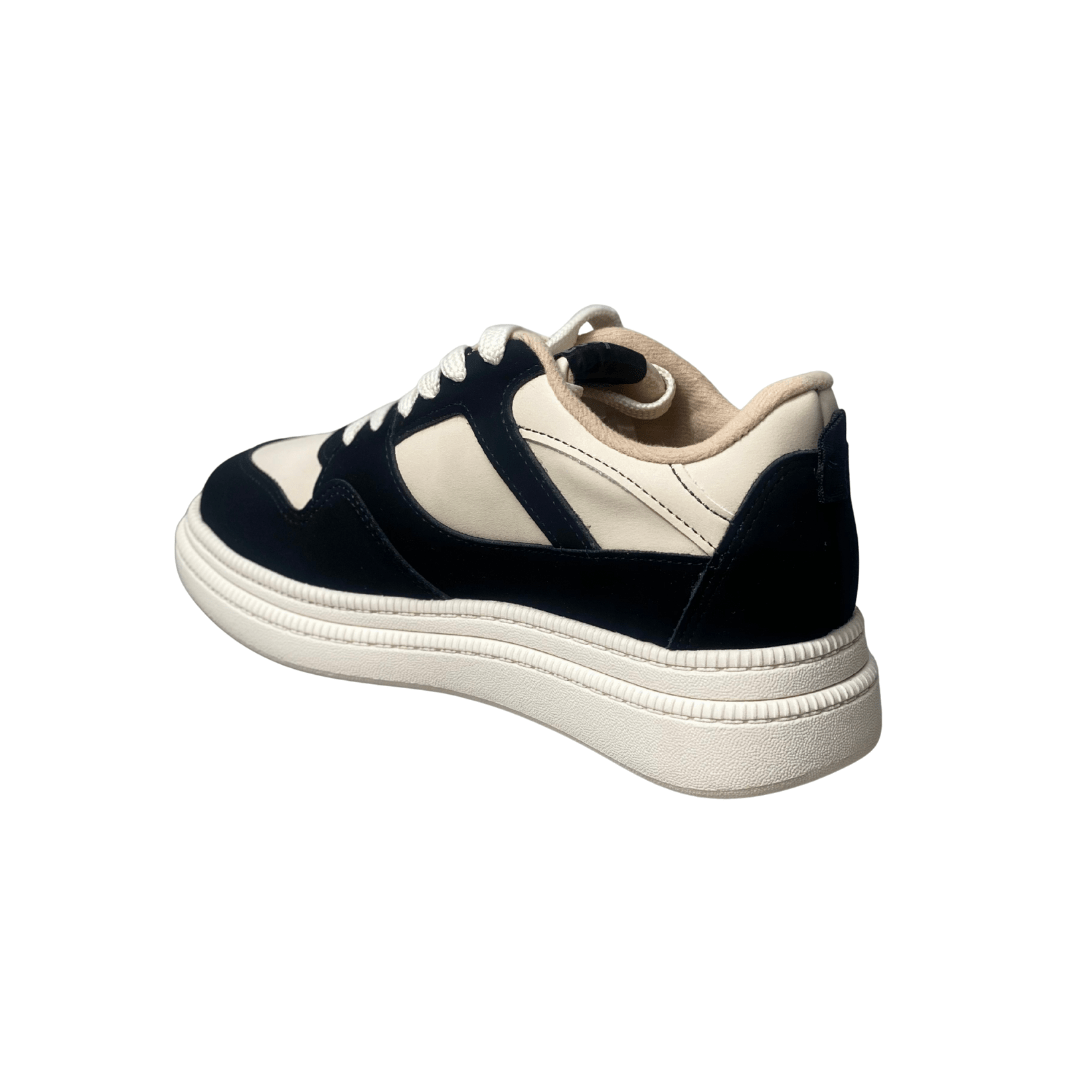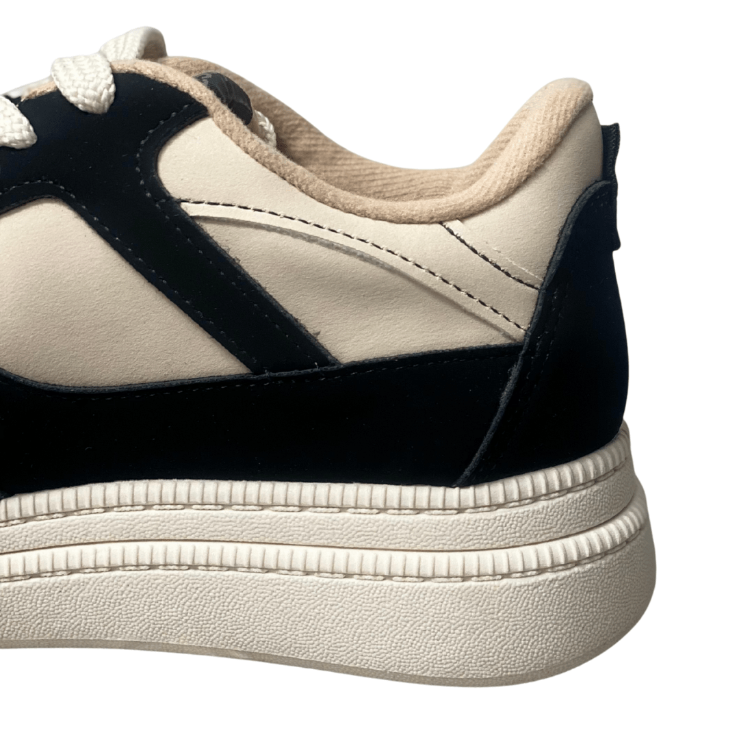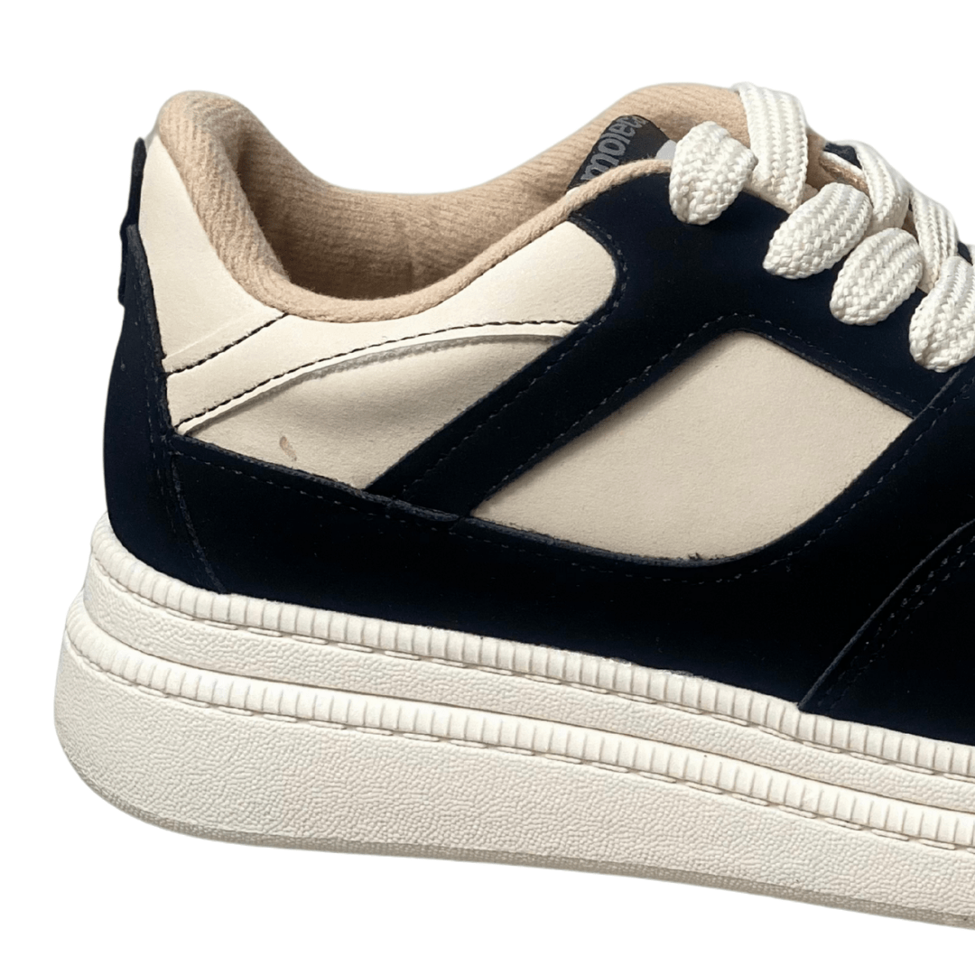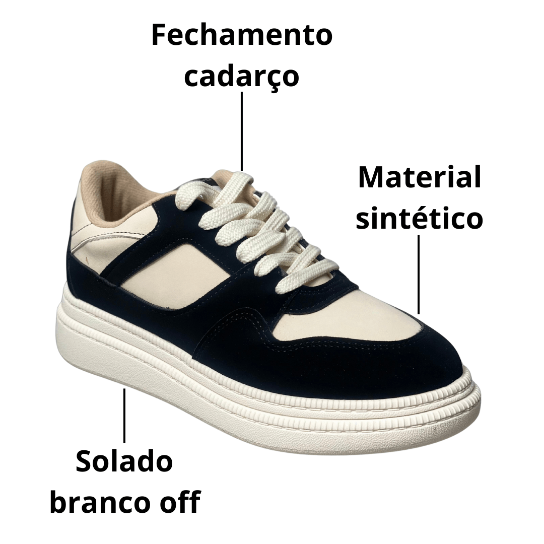 O Tênis Moleca Feminino Branco Off com Cadarço é "estiloso e lindo", apresentando um contraste marcante entre o branco off-white e recortes em preto que conferem uma personalidade única ao calçado. Com um solado flatform estruturado, ele garante alguns centímetros a mais com total estabilidade, sendo perfeito para mulheres que buscam um look atual e dinâmico.