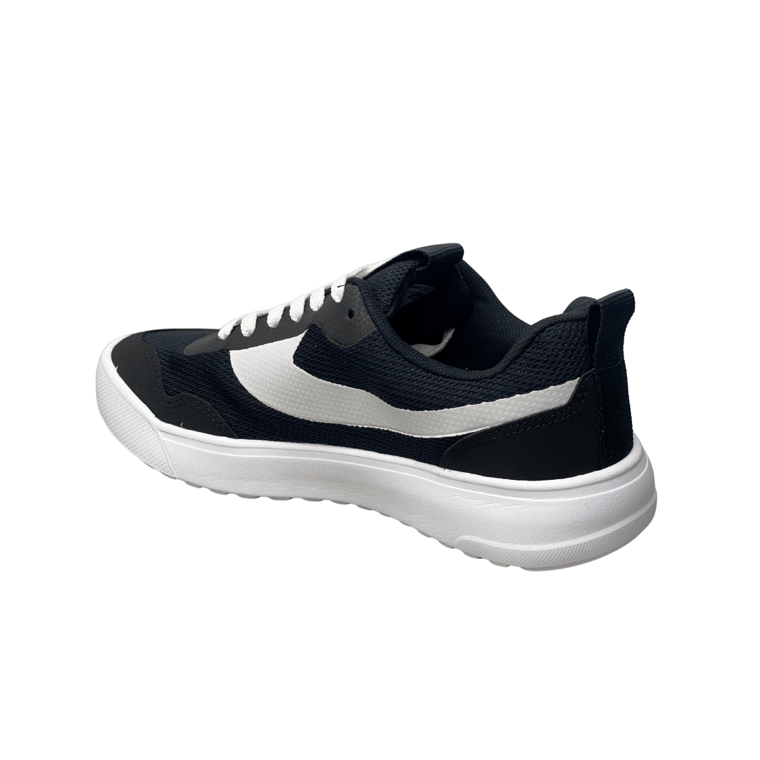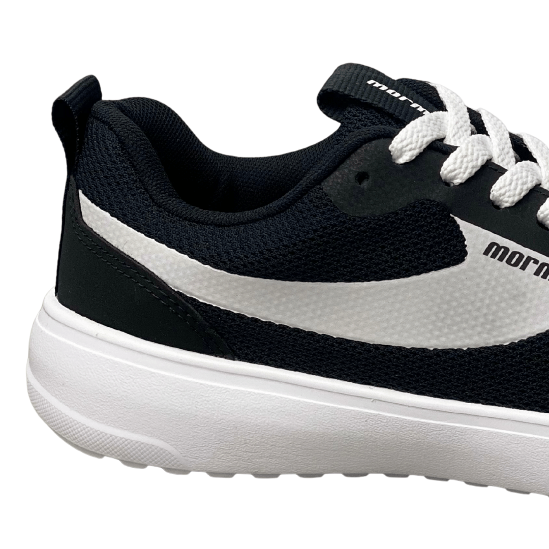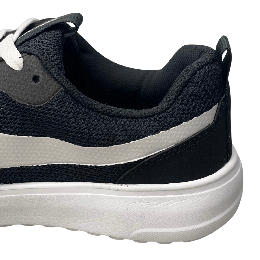Cores: Predominantemente preto com detalhes em branco (logo, cadarços e solado).