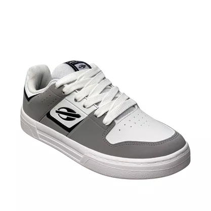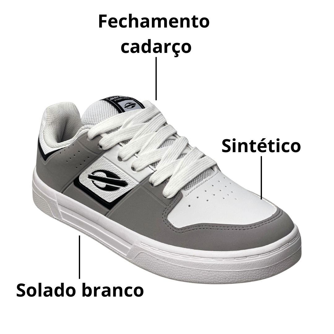 Cores: Cabedal em cinza claro e branco, com detalhes em preto no calcanhar e sola branca.