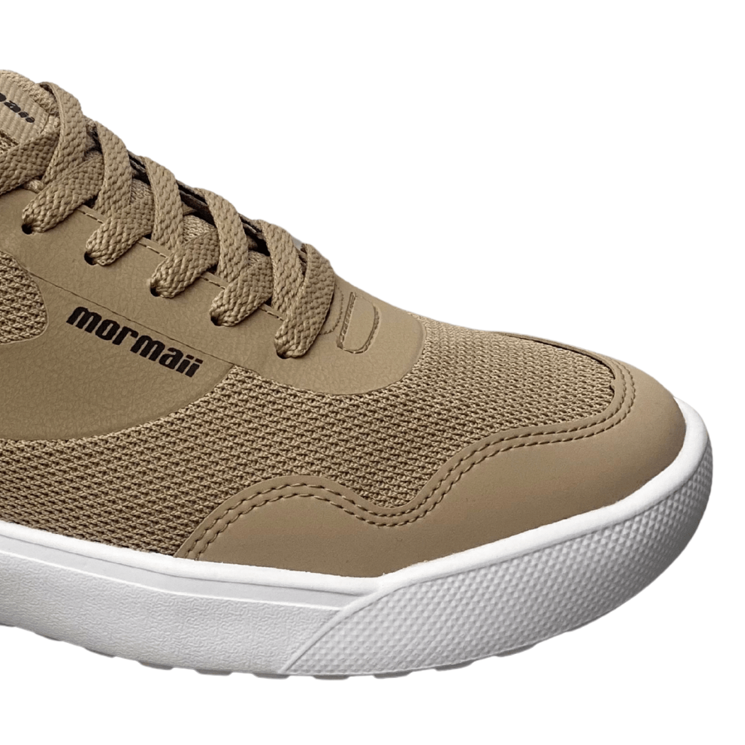 Design: Acabamento em tom cáqui/areia com detalhes da marca Mormaii na lateral, lingueta e puxador.