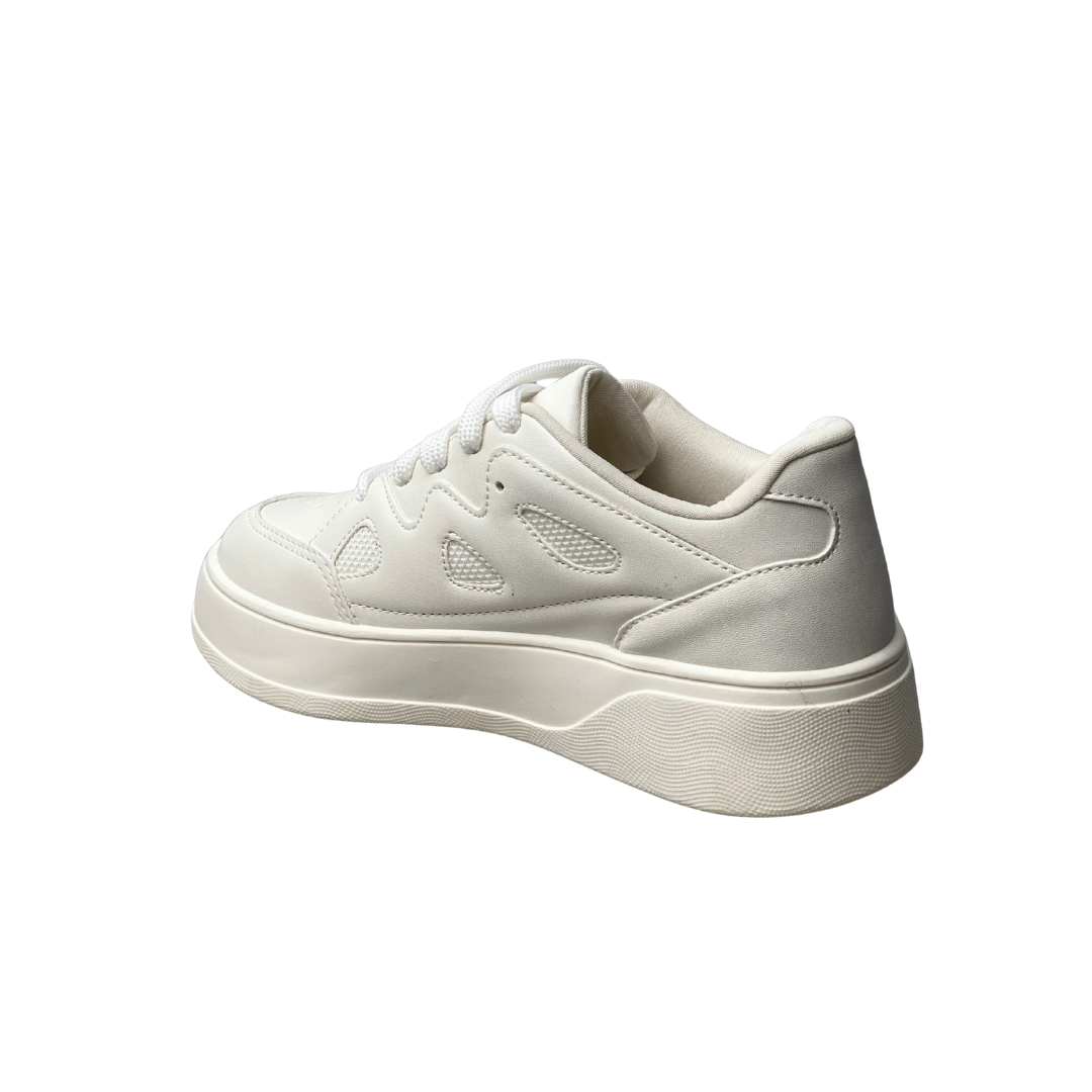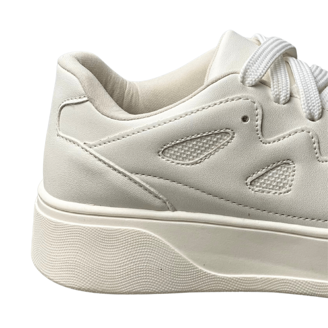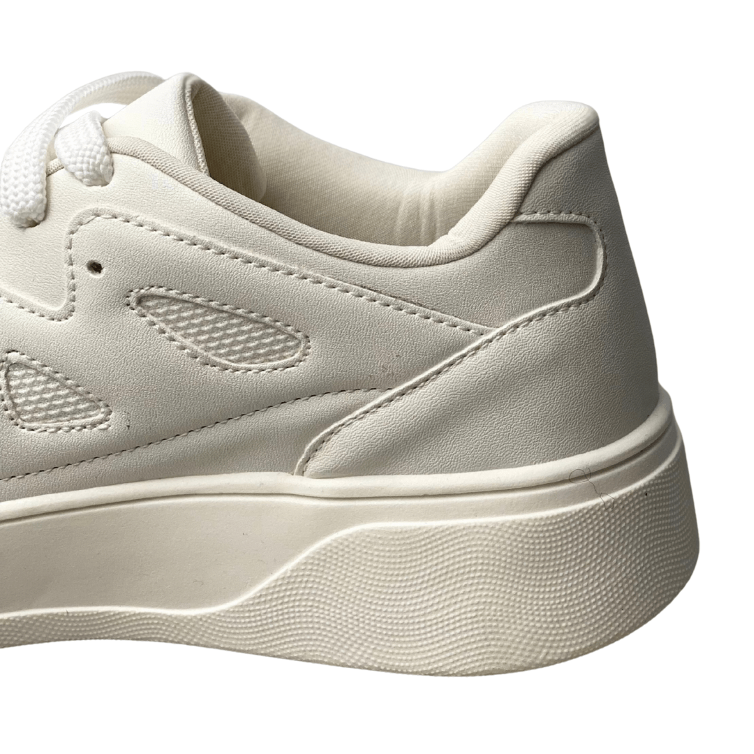 Design: Tênis de cano baixo, estilo chunky ou dad shoe, com solado alto e volumoso.
