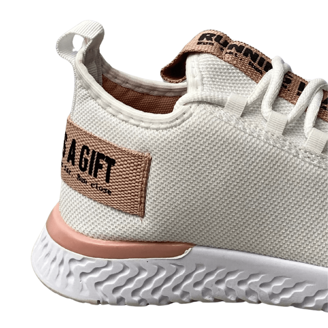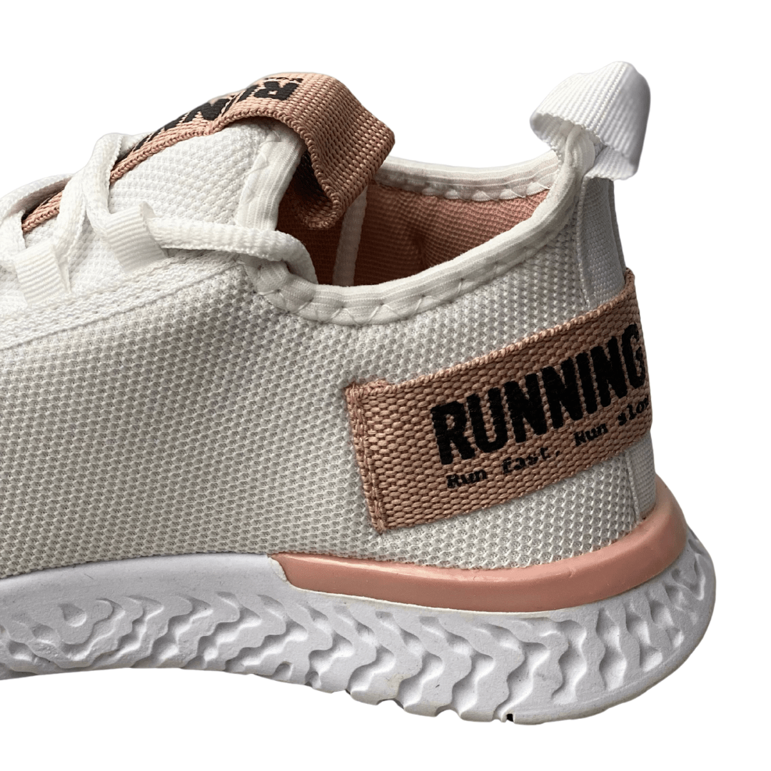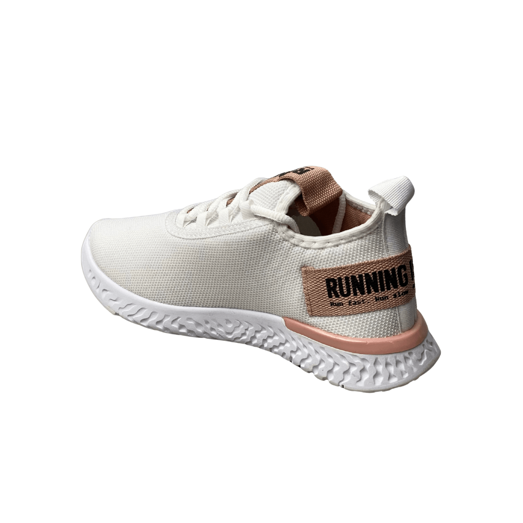 Design: Possui um detalhe em alça/fita com a palavra "RUNNING" (ou similar) na lingueta e reforços laterais em material sintético/borracha.