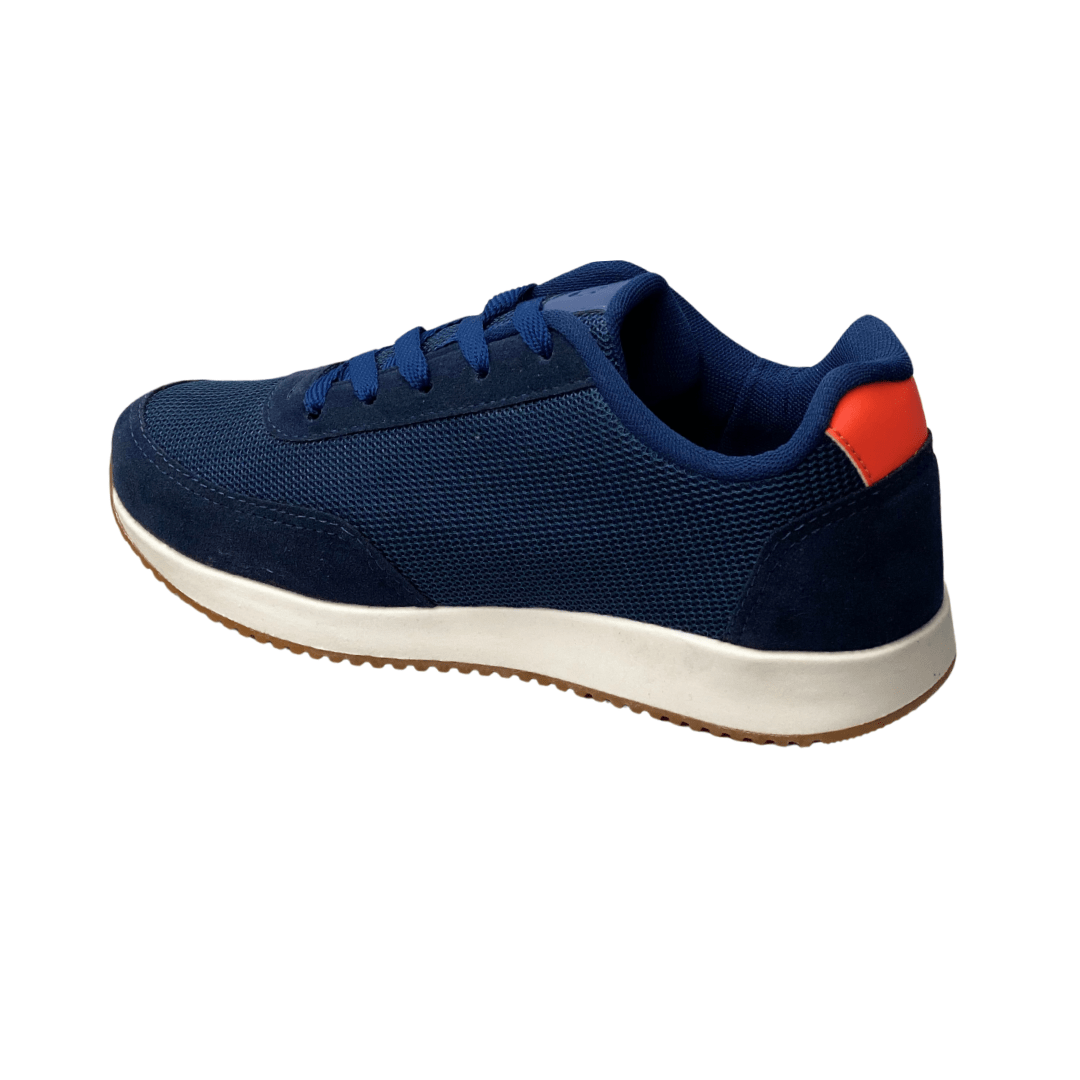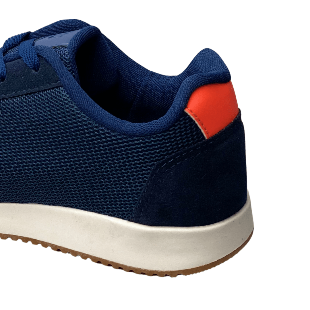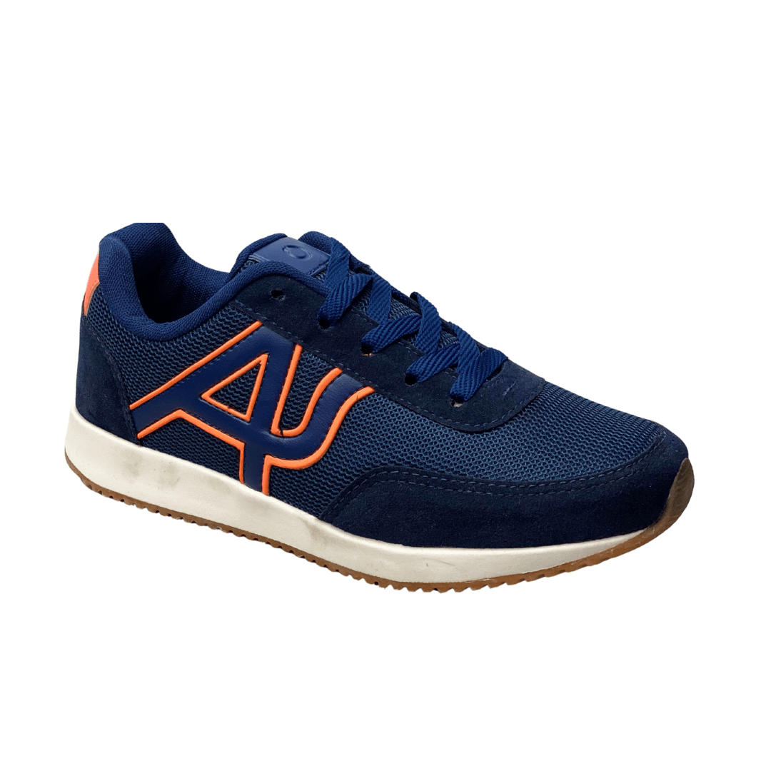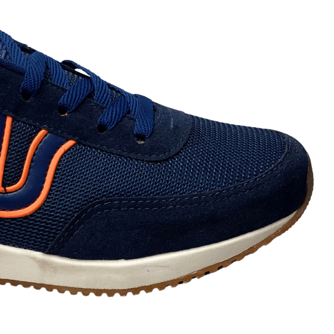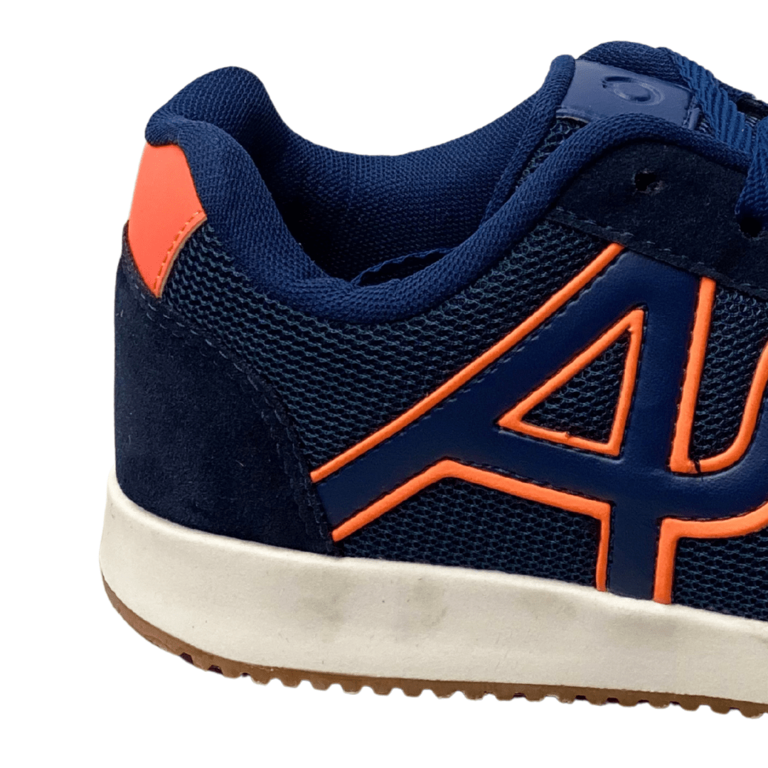 Seu design moderno combina o tom azul-marinho com detalhes em laranja, garantindo um visual jovem e esportivo.