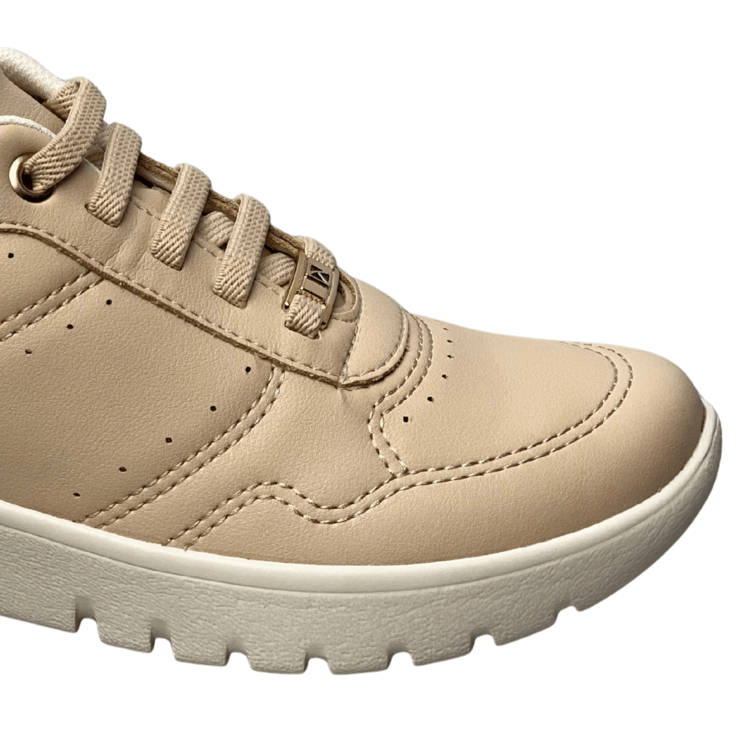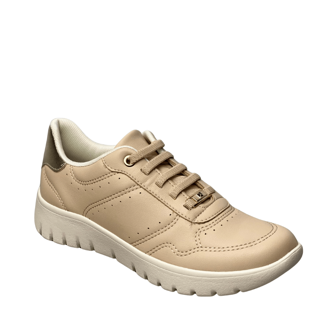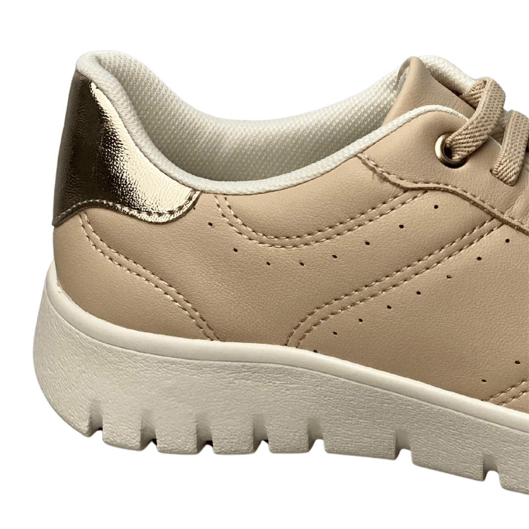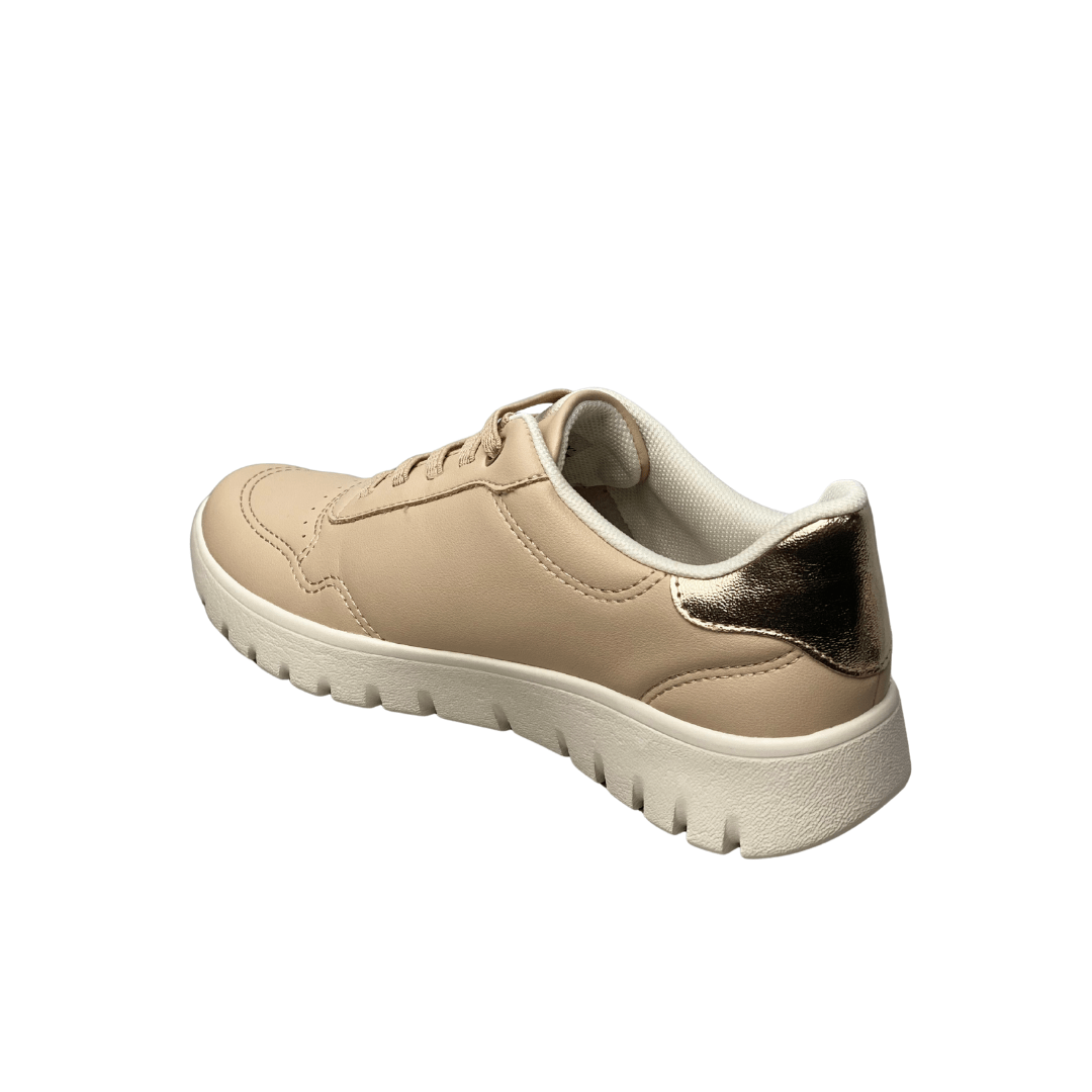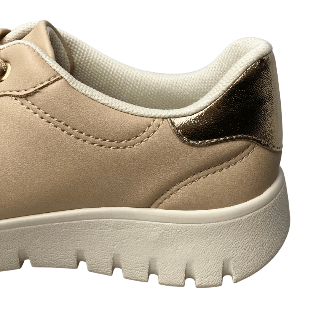 Acabamento de Luxo: Apresenta detalhes metálicos dourados nos passadores e um acabamento brilhante no calcanhar, elevando o tênis de um item esportivo para um acessório de moda.