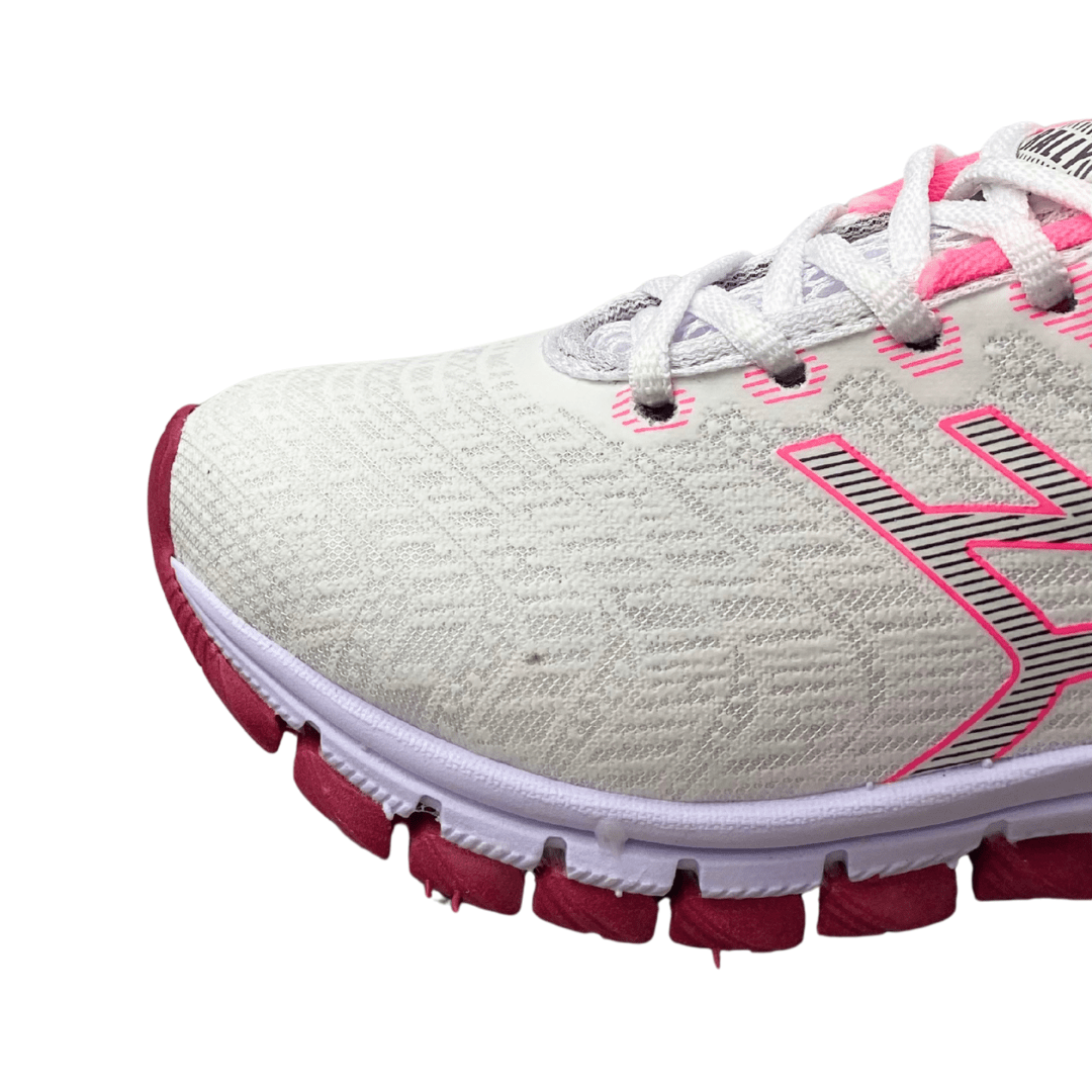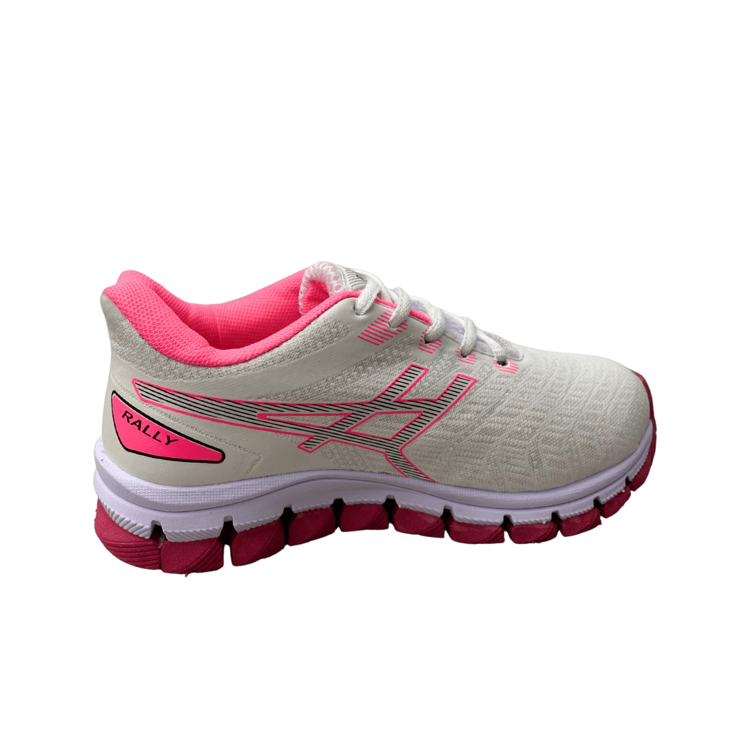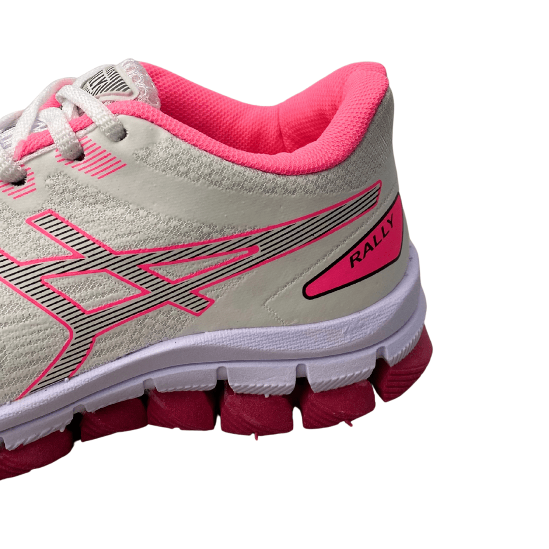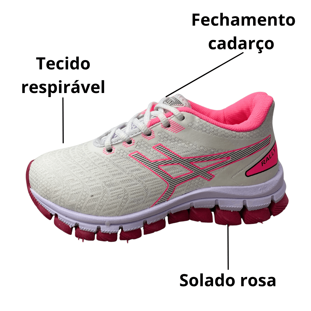 Cor: Branco com detalhes em rosa e sola branca com entressola amortecida.