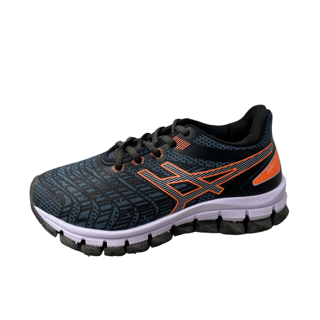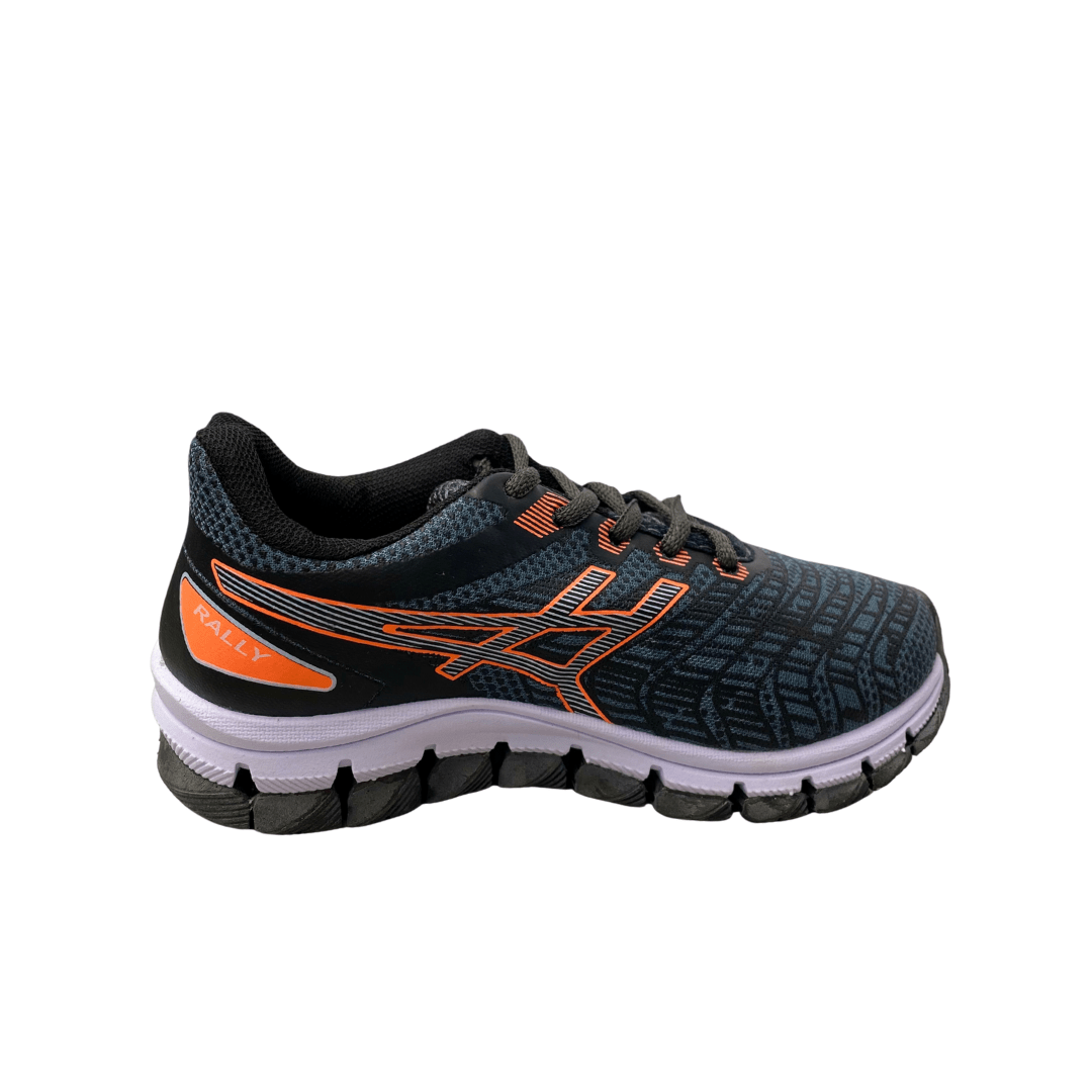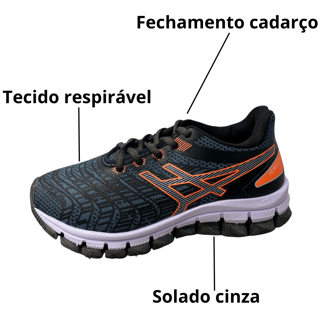 Cor: Grafite com detalhes em laranja e sola branca com entressola amortecida.