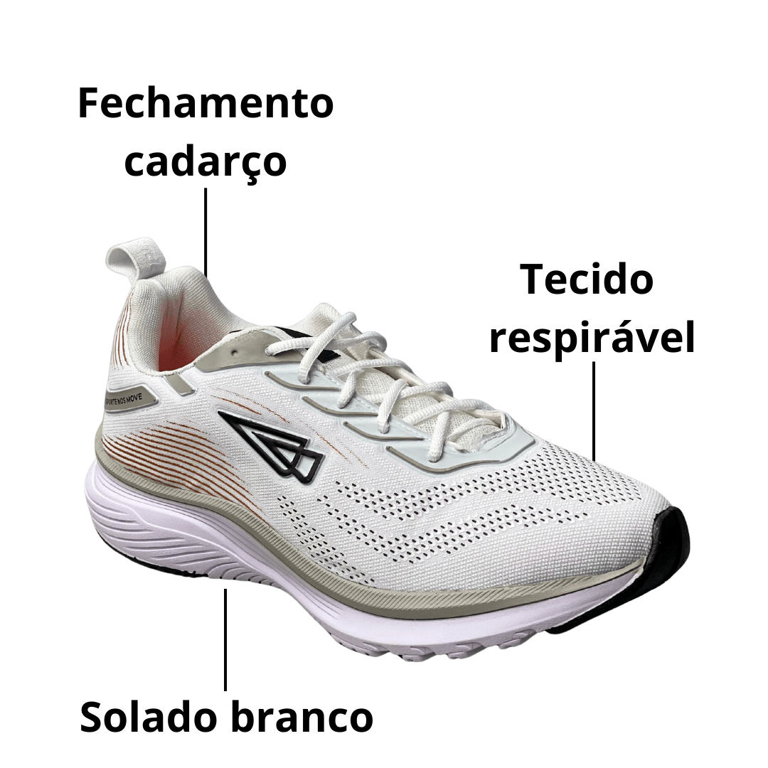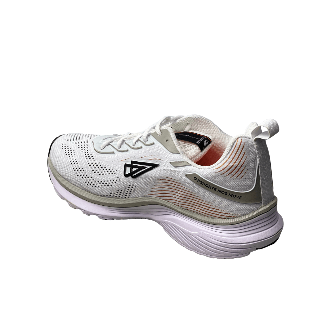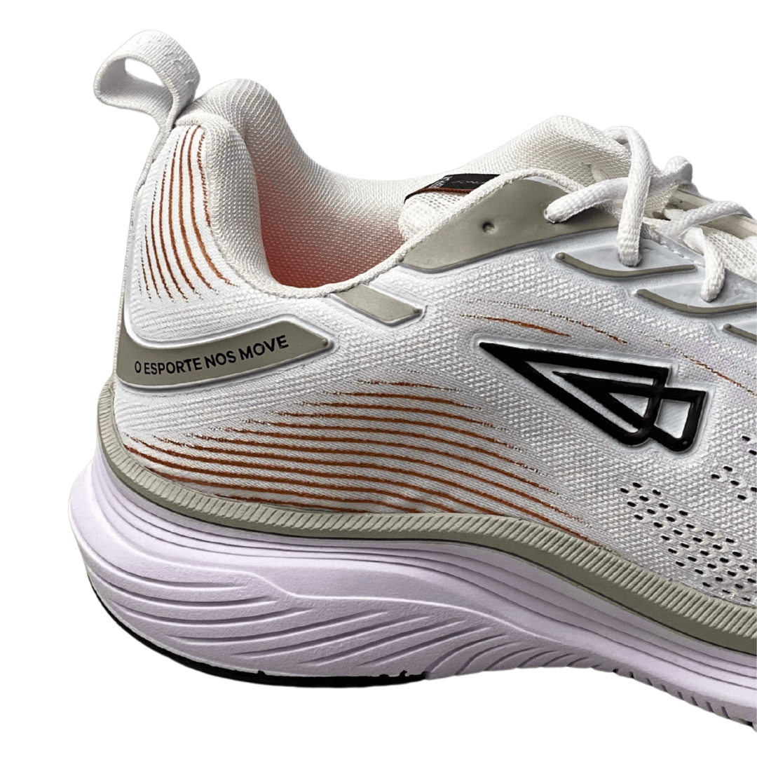 Estilo Esportivo Sofisticado: O design clean em branco com detalhes pontuais e o logo moderno (triângulo preto) confere um visual esportivo que se encaixa perfeitamente no dia a dia.