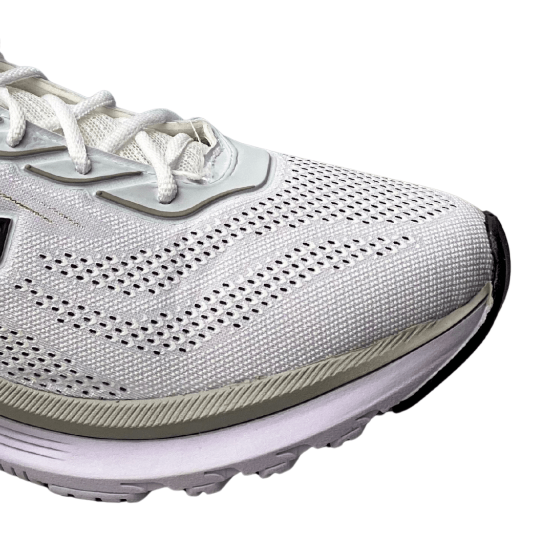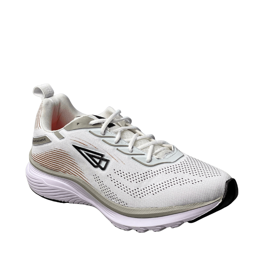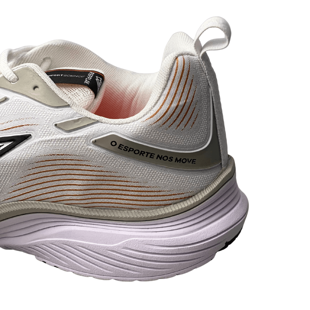 Estilo Esportivo Sofisticado: O design clean em branco com detalhes pontuais e o logo moderno (triângulo preto) confere um visual esportivo que se encaixa perfeitamente no dia a dia.