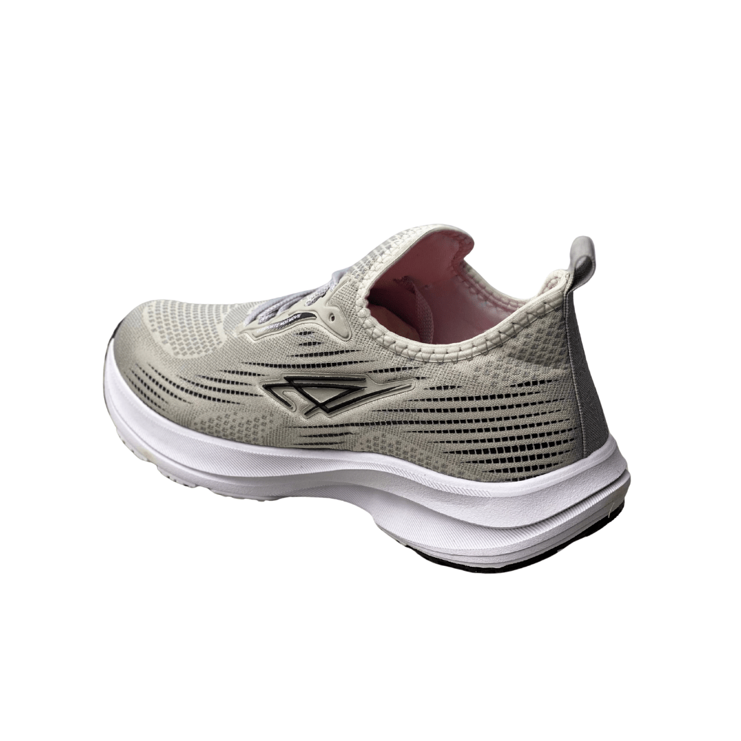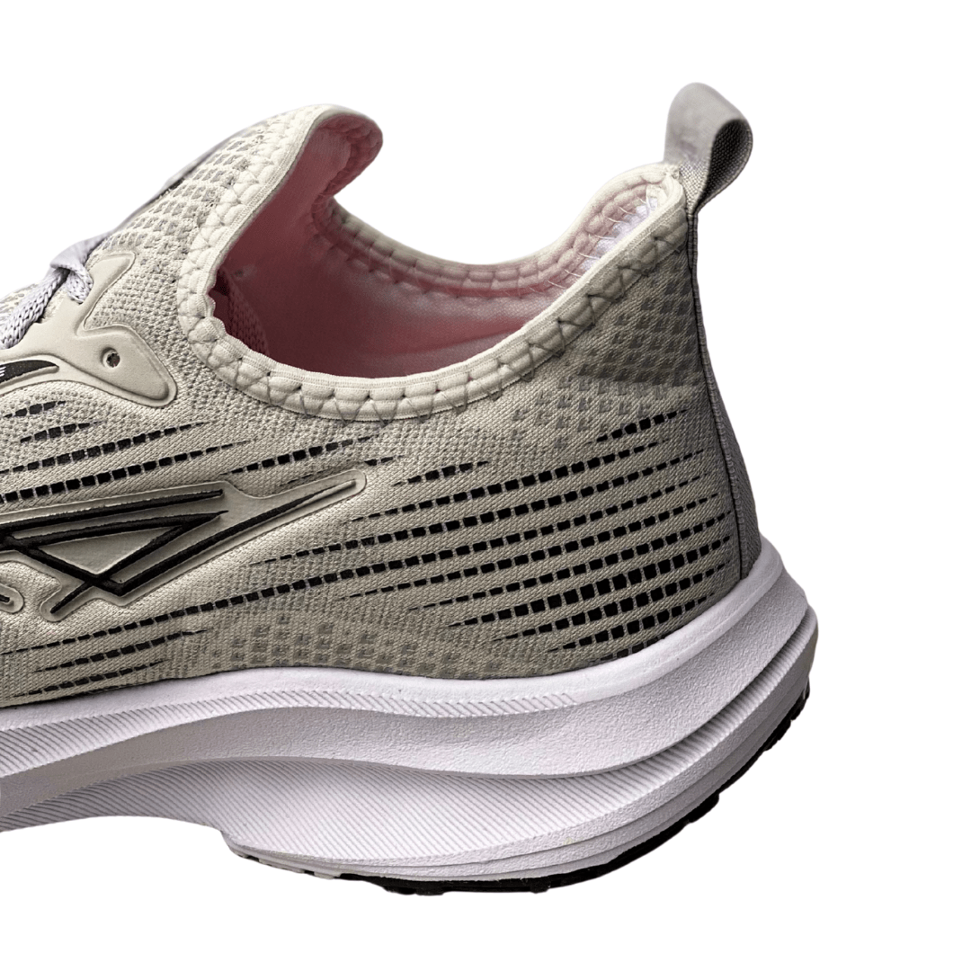Cabedal: Knit ou tecido sintético em tom Cinza Claro/Bege, com listras em tom mais escuro.
