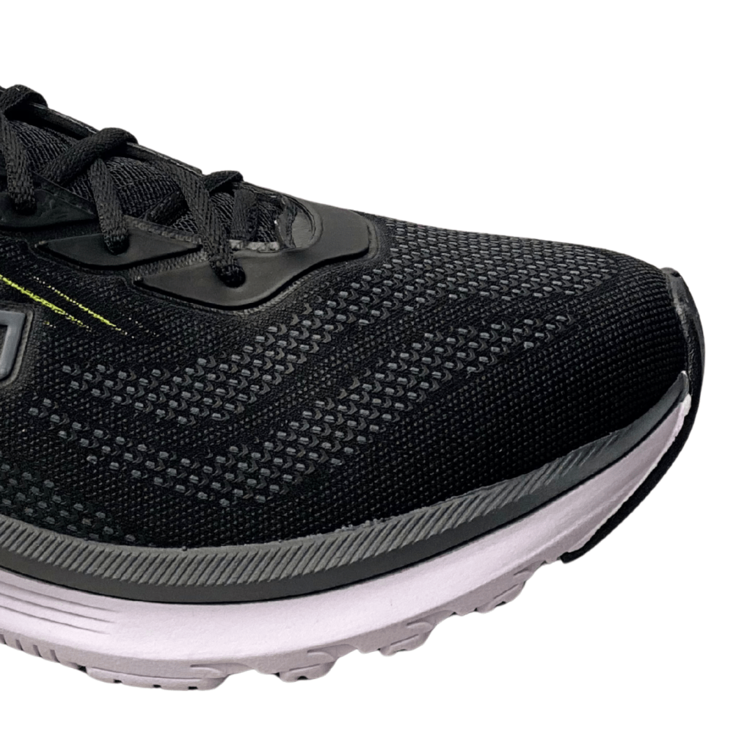 Conforto Respirável: O tecido em malha knit/mesh de dupla camada na cor preta permite a circulação de ar, mantendo os pés secos e confortáveis mesmo em treinos longos.