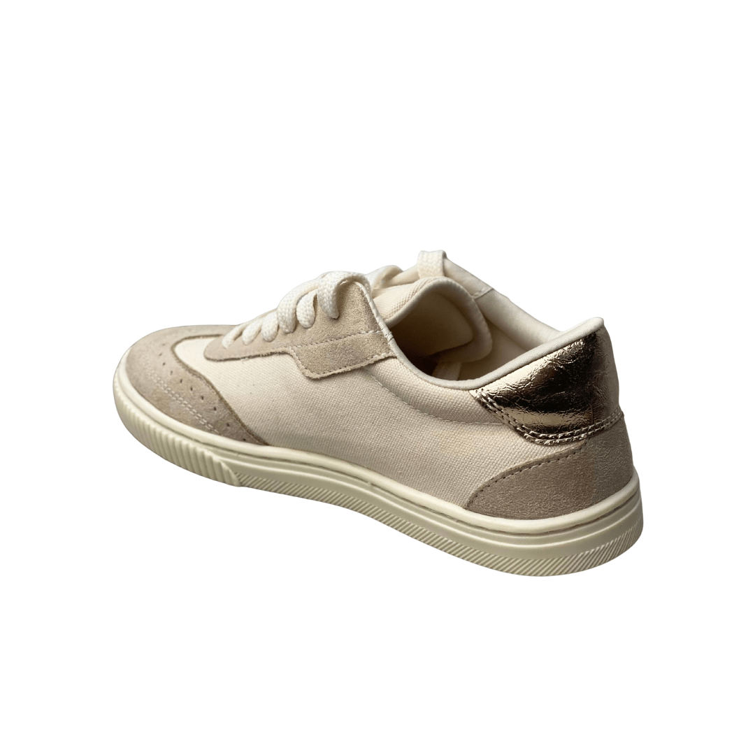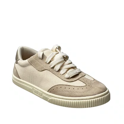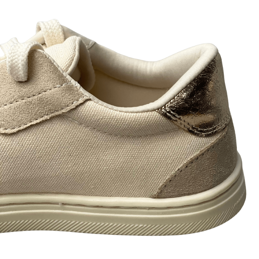 | Detalhes: | Corpo em trama/tecido de linho; Listras laterais em suede cinza claro; Detalhe metálico dourado no calcanhar |