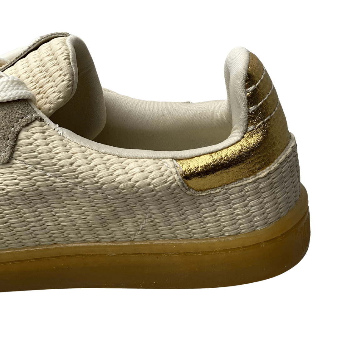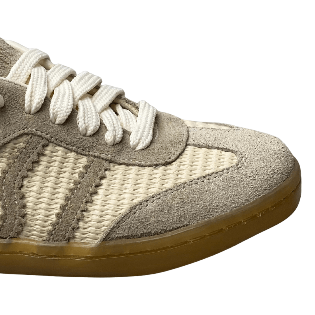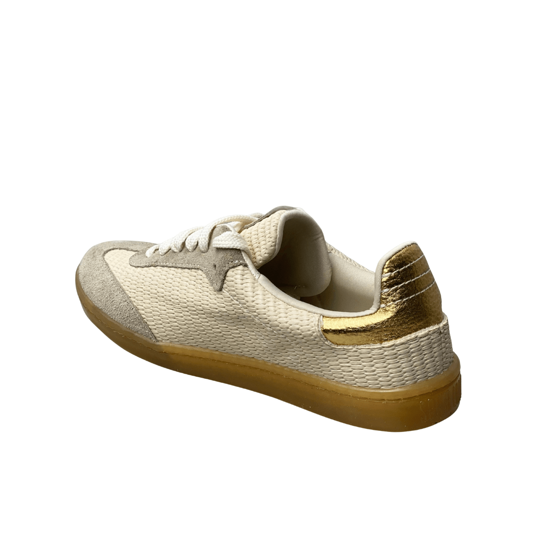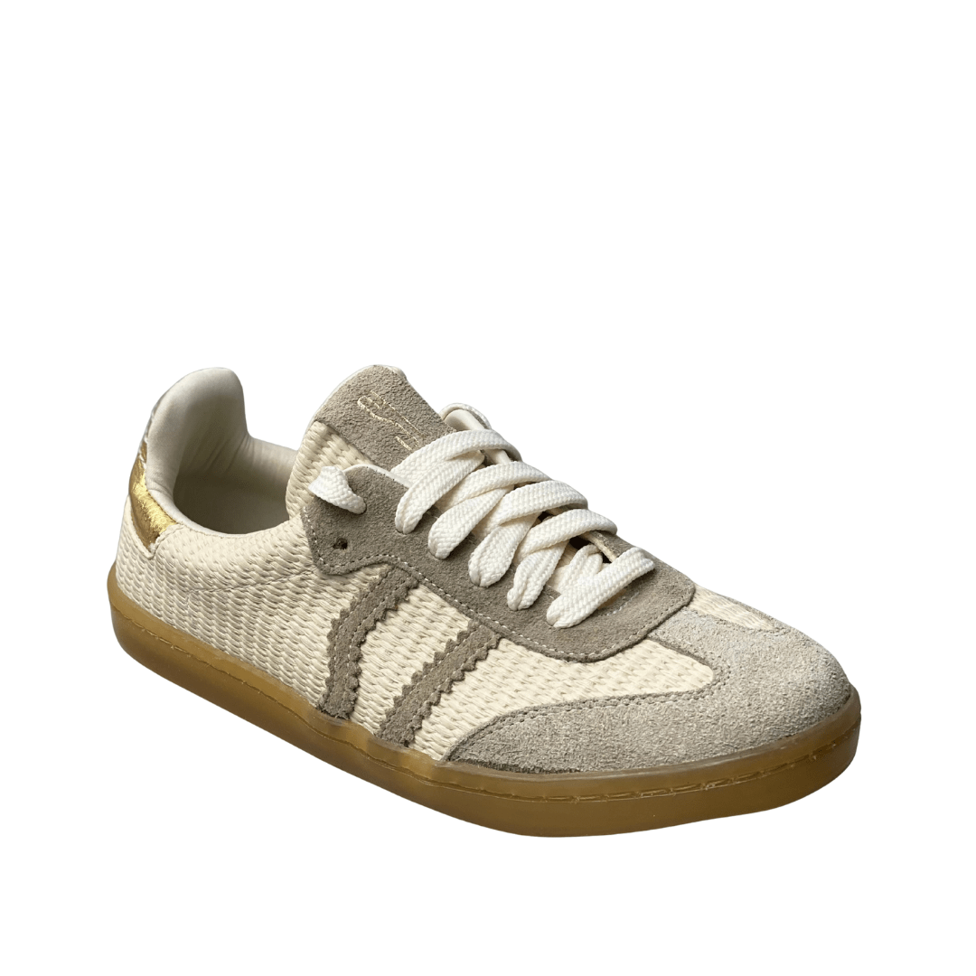 | Detalhes: | Corpo em trama/tecido de linho; Listras laterais em camurça cinza claro; Detalhe dourado no calcanhar |