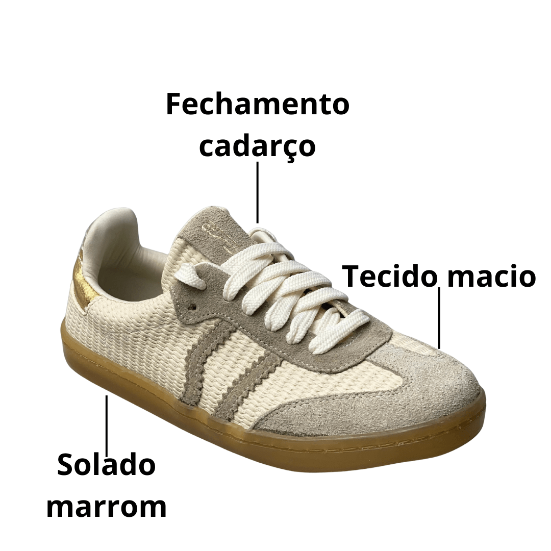 | Fechamento: | Cadarço largo na cor crua/creme |