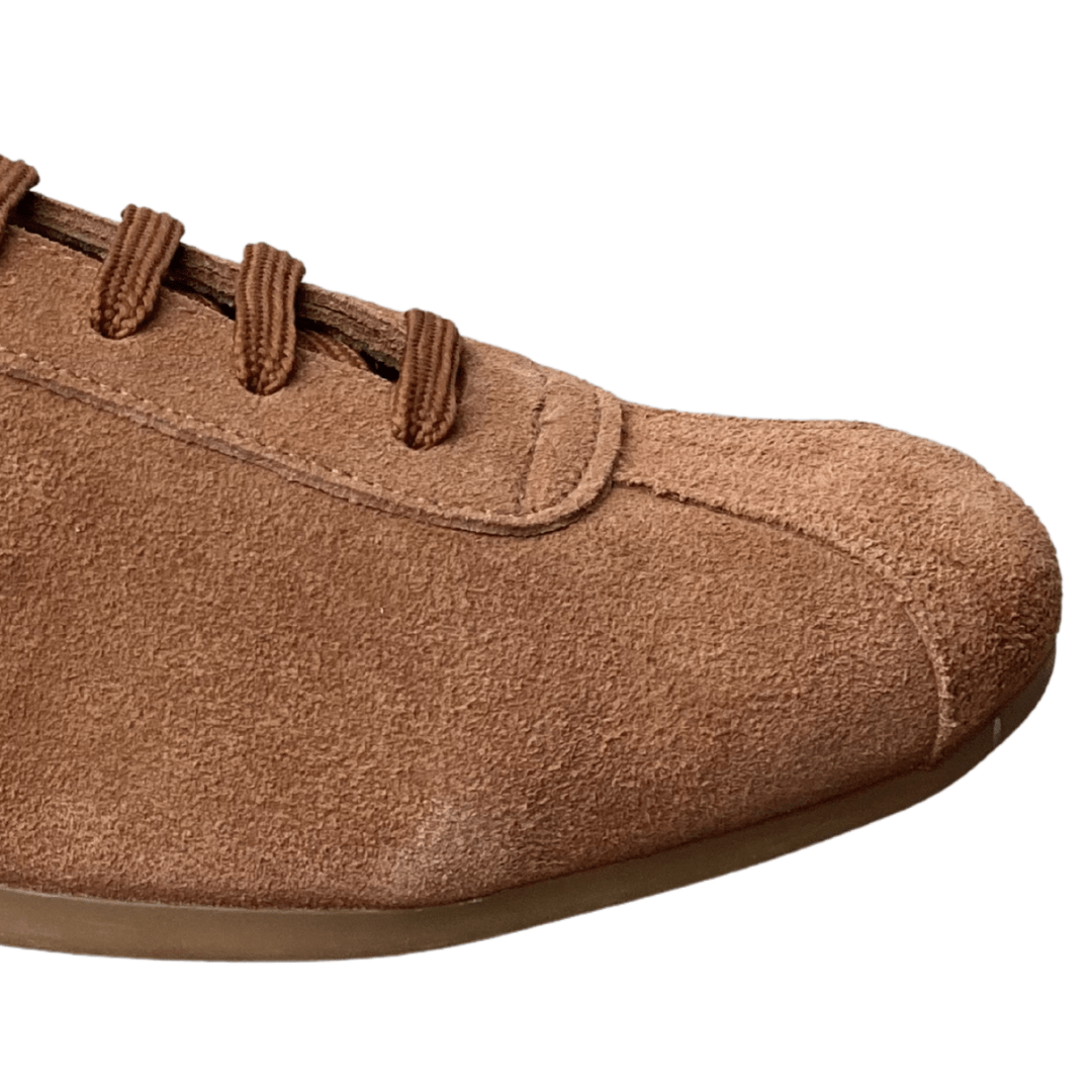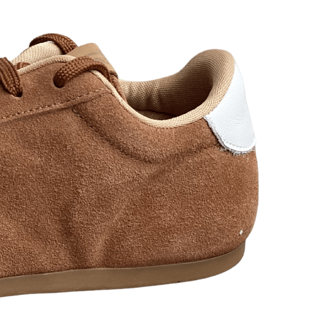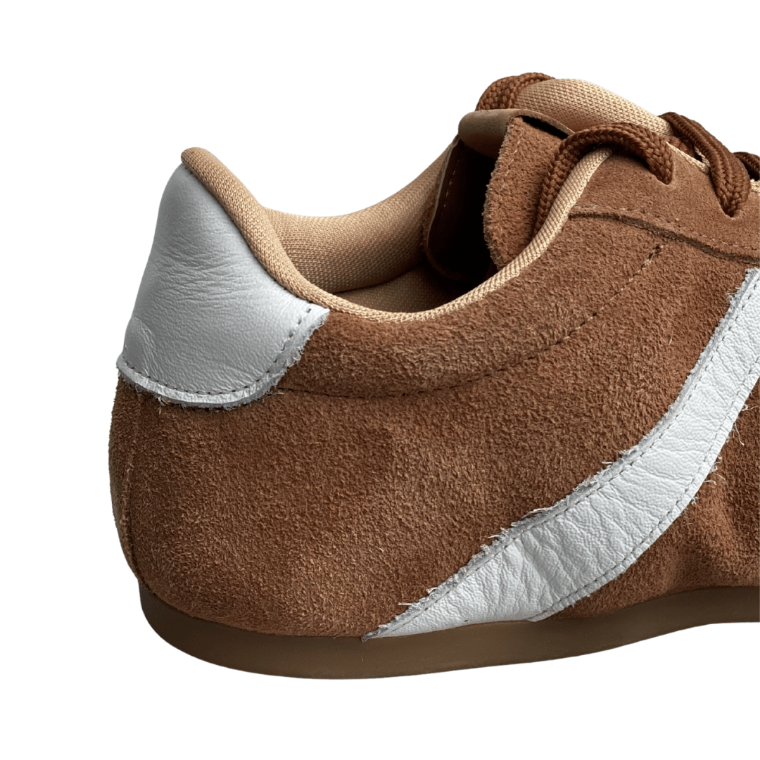 O Tênis Santinelli na cor caramelo destaca-se pela sua silhueta rasteira e minimalista. O contraste marcante entre o marrom quente da camurça e os detalhes em branco nas laterais e no calcanhar confere um visual esportivo retrô que é, ao mesmo tempo, "lindo e estiloso".