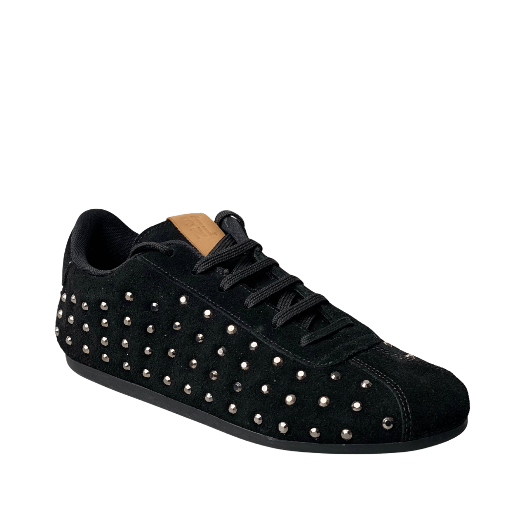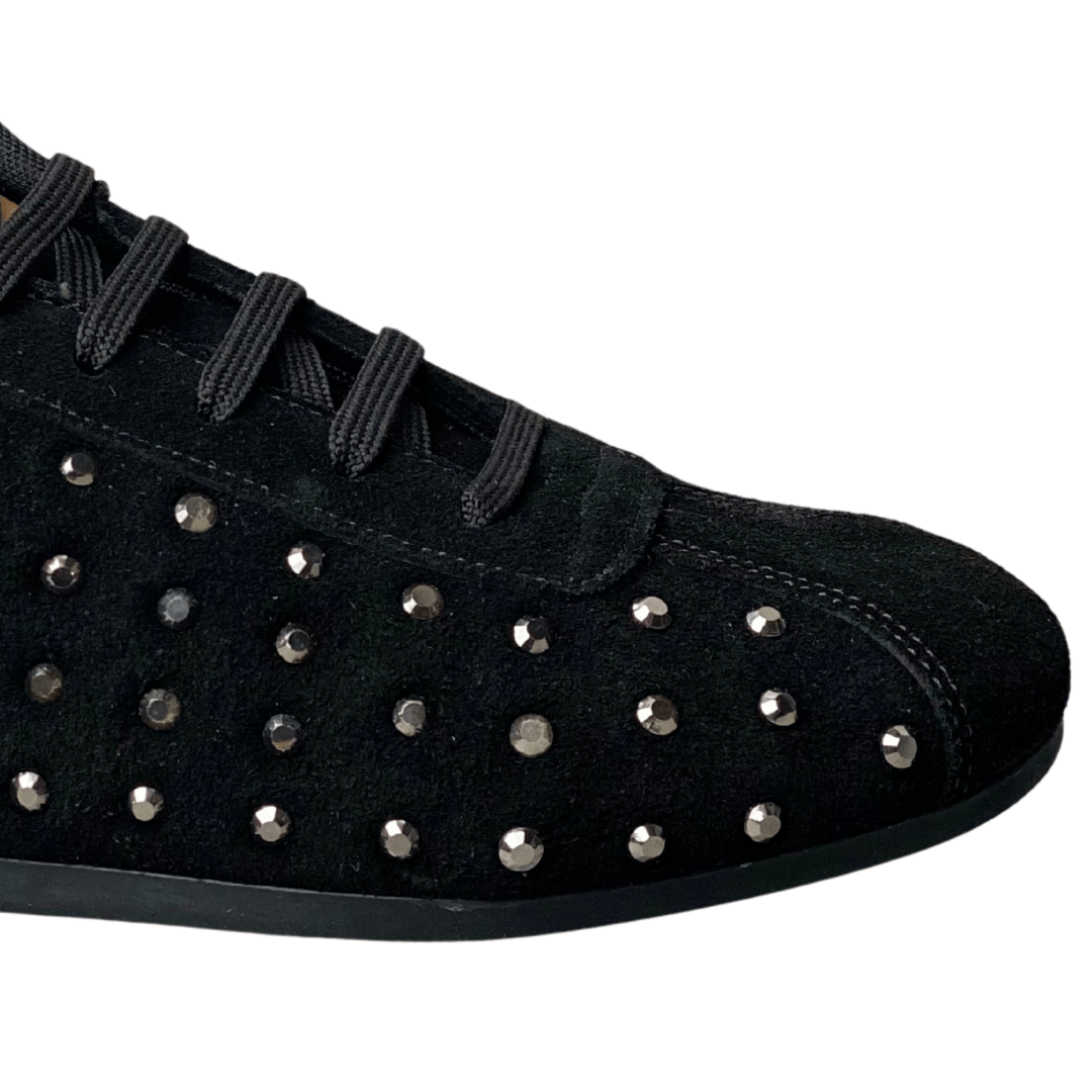 O Tênis Santinelli em couro preto é um clássico reinventado. Sua base monocromática destaca a aplicação lateral de cristais, que adicionam um ponto de luz sofisticado ao design. É o calçado "confortável, estiloso e lindo" que transita do escritório ao happy hour com facilidade.
