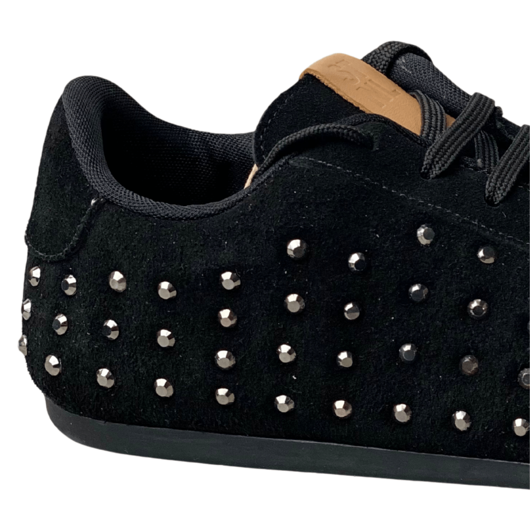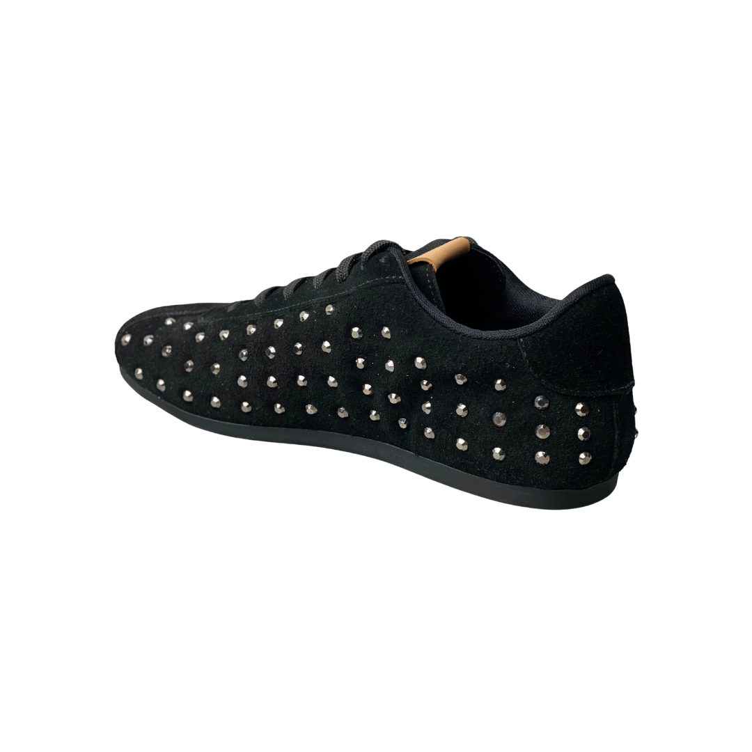 Brilho Sofisticado: As pedrarias laterais conferem um ar glamouroso, elevando o tênis de um item esportivo para uma peça de moda.