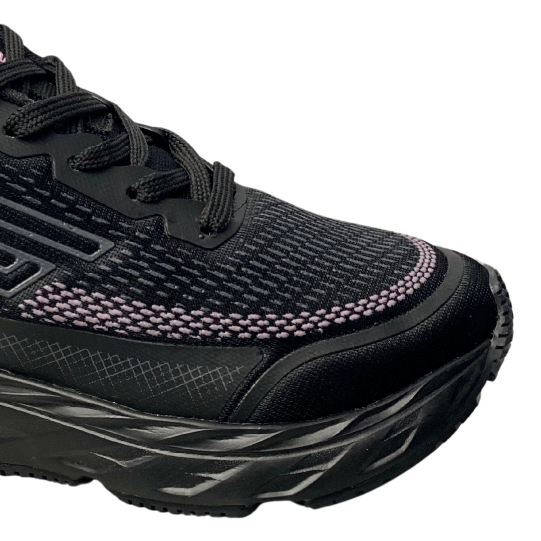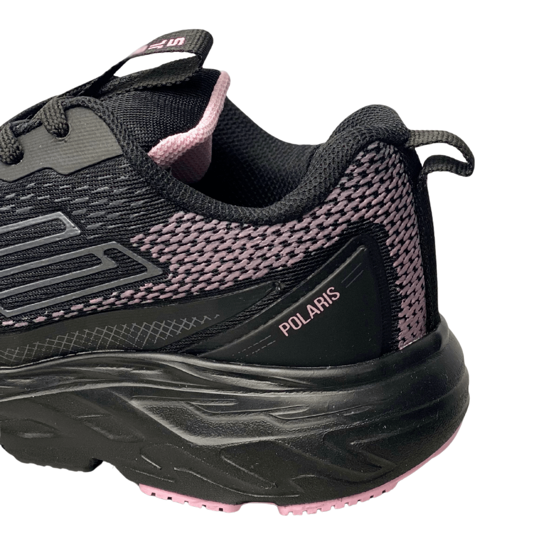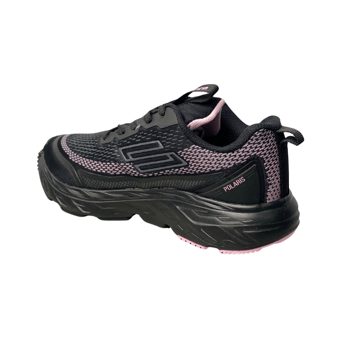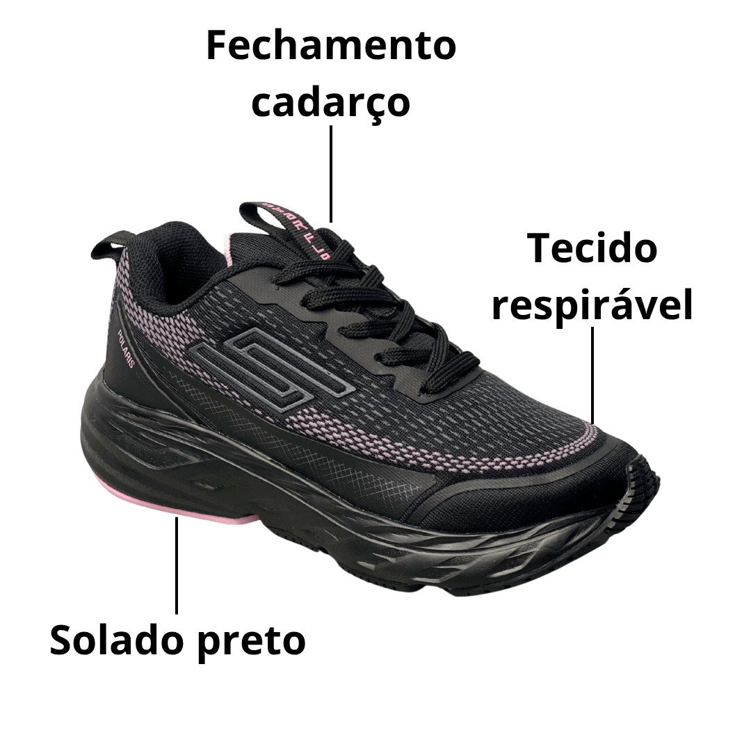 Cor: Preto predominante, com detalhes e pontos de Mesh na cor Rosa Claro/Lilás. Sola e cadarços pretos.