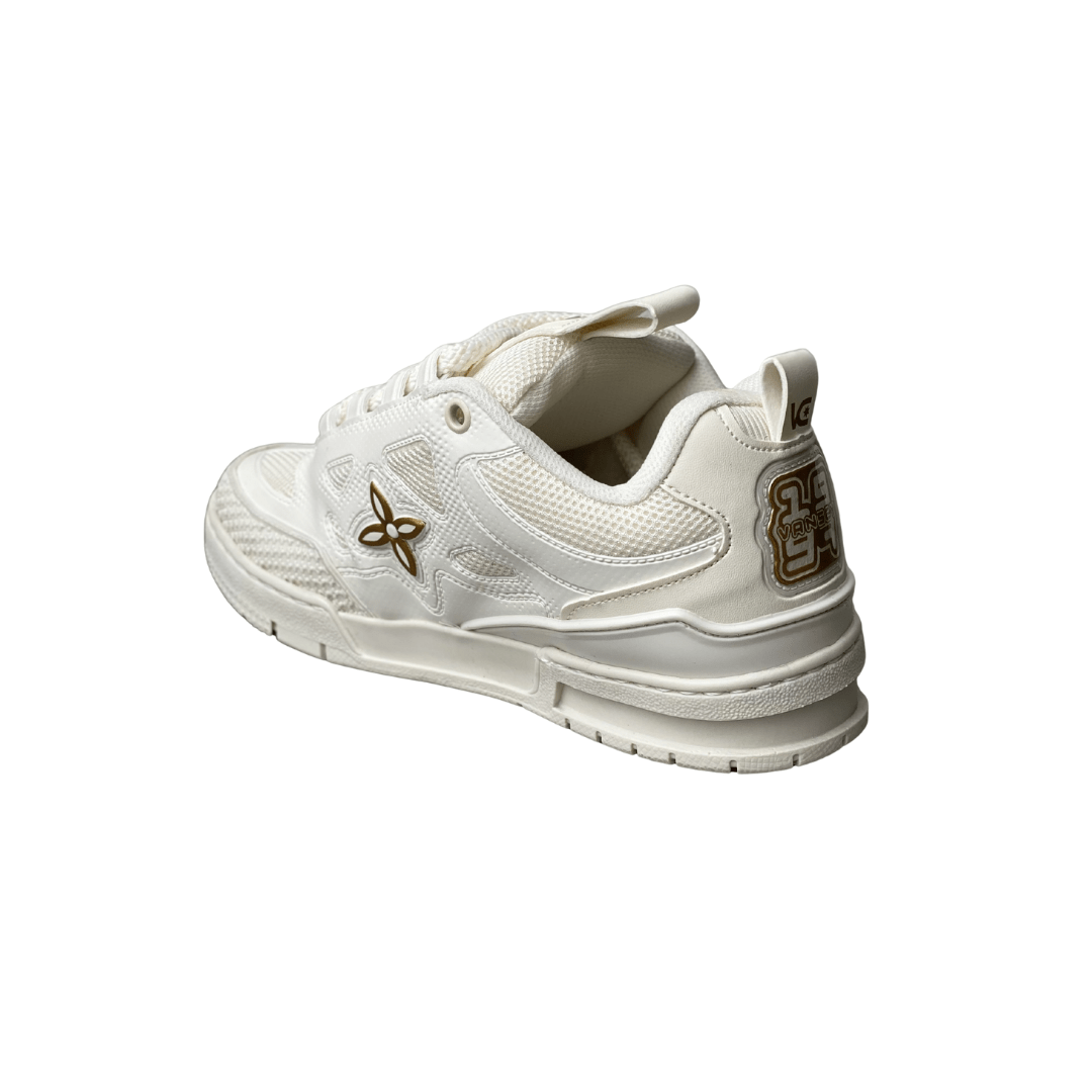 Cores: Predominantemente Off White com detalhes elegantes em dourado no logo e nos acabamentos.