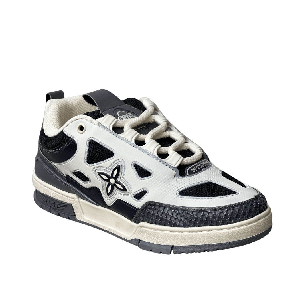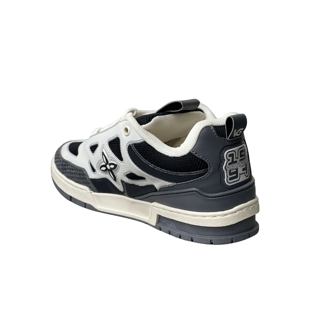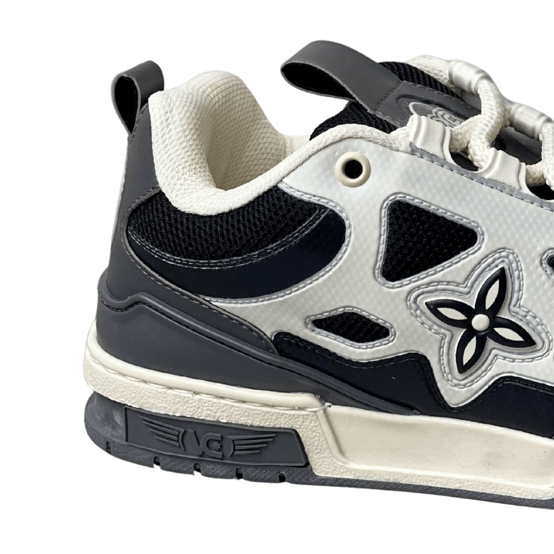 Design de Cabedal: Composto por camadas sobrepostas de material sintético e tecido, apresentando detalhes geométricos e uma flor estilizada na lateral.