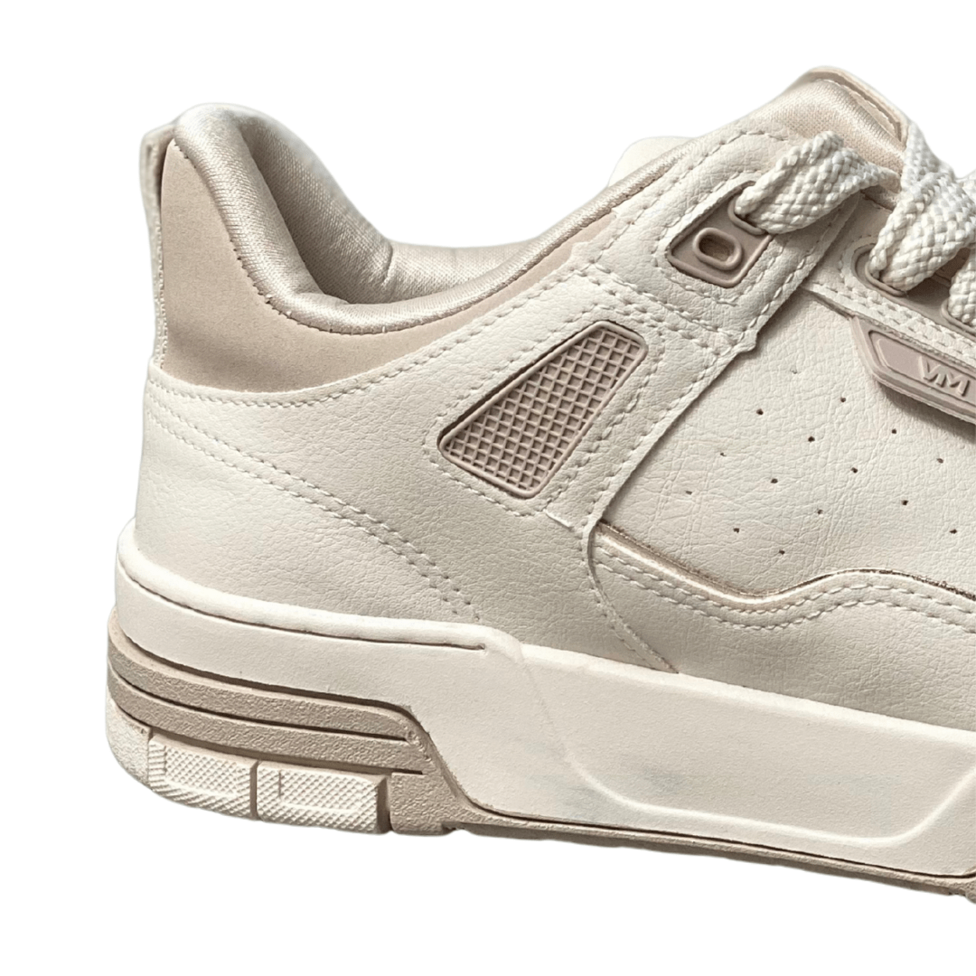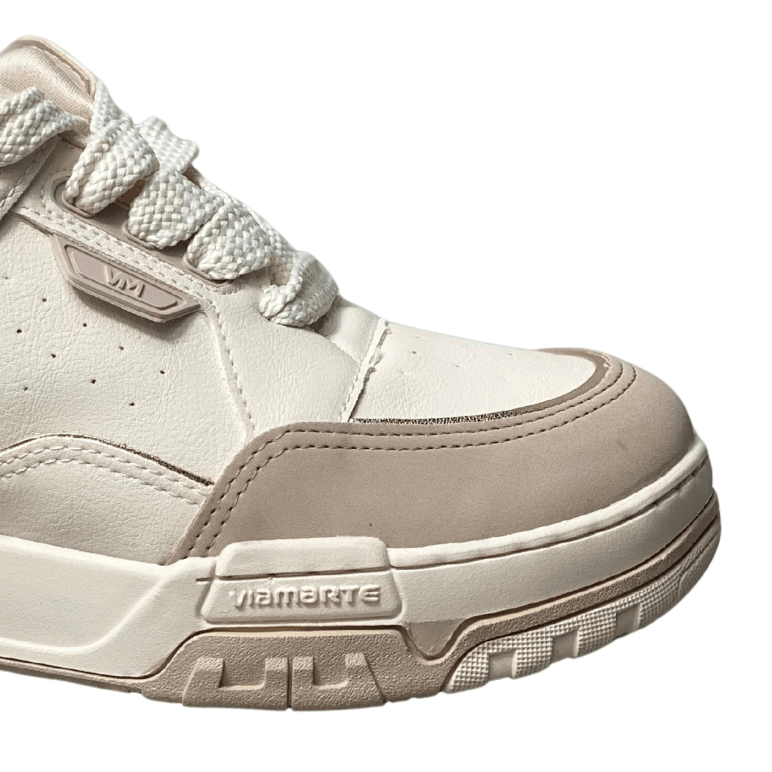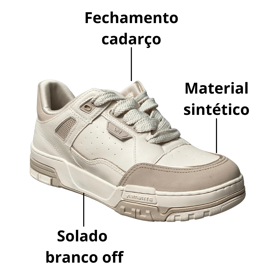 Versatilidade Cromática: A combinação de branco com recortes bege torna este tênis extremamente fácil de combinar com qualquer paleta de cores.
