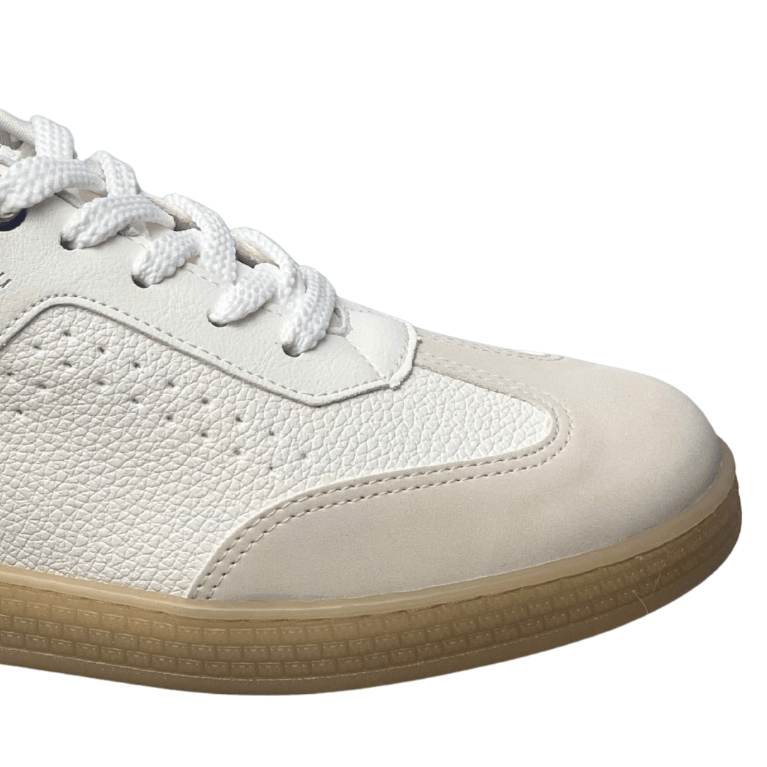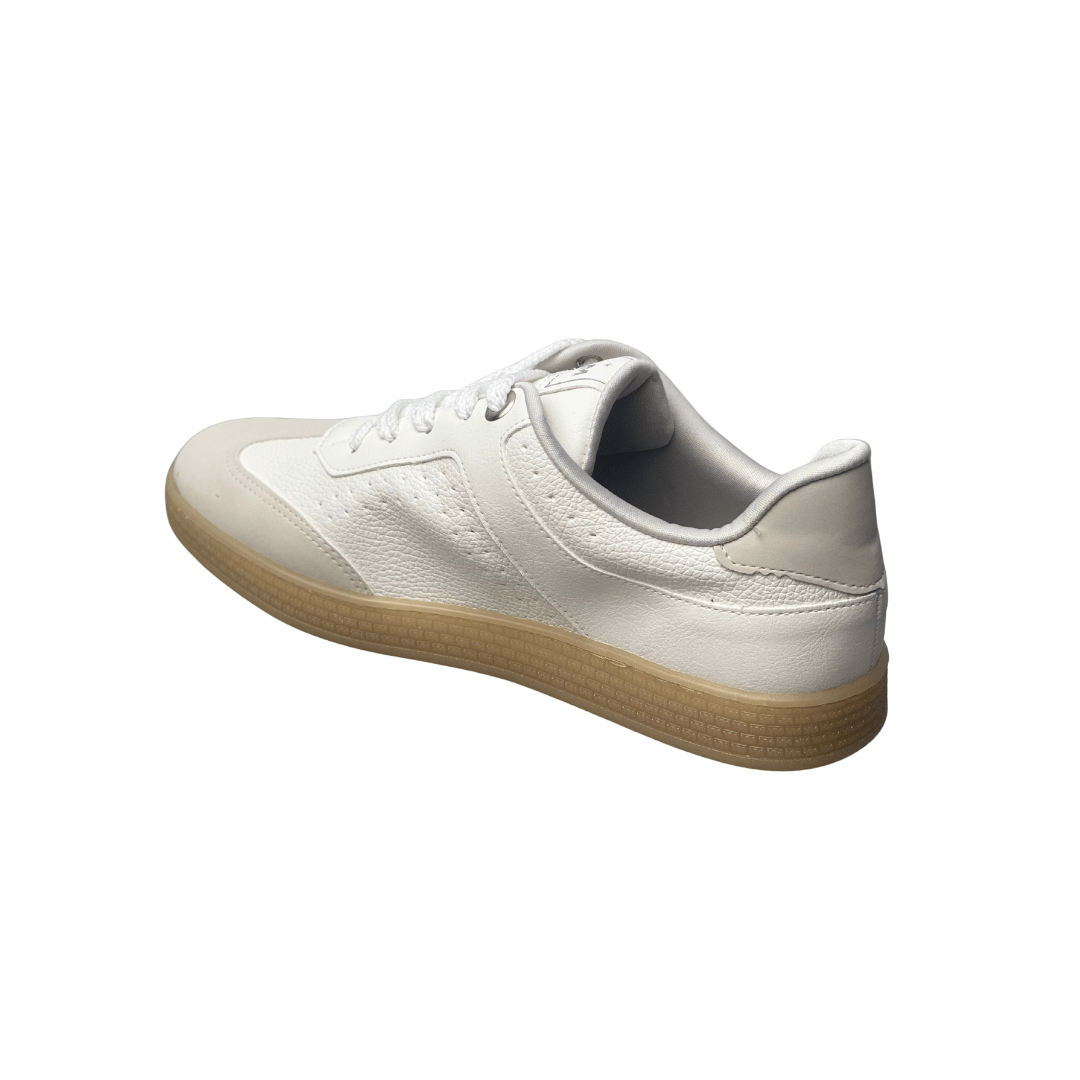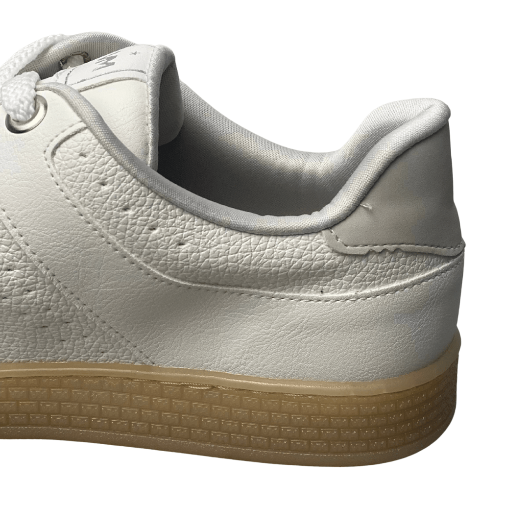 Fechamento: Cadarços planos na cor branca para um ajuste firme e visual limpo.