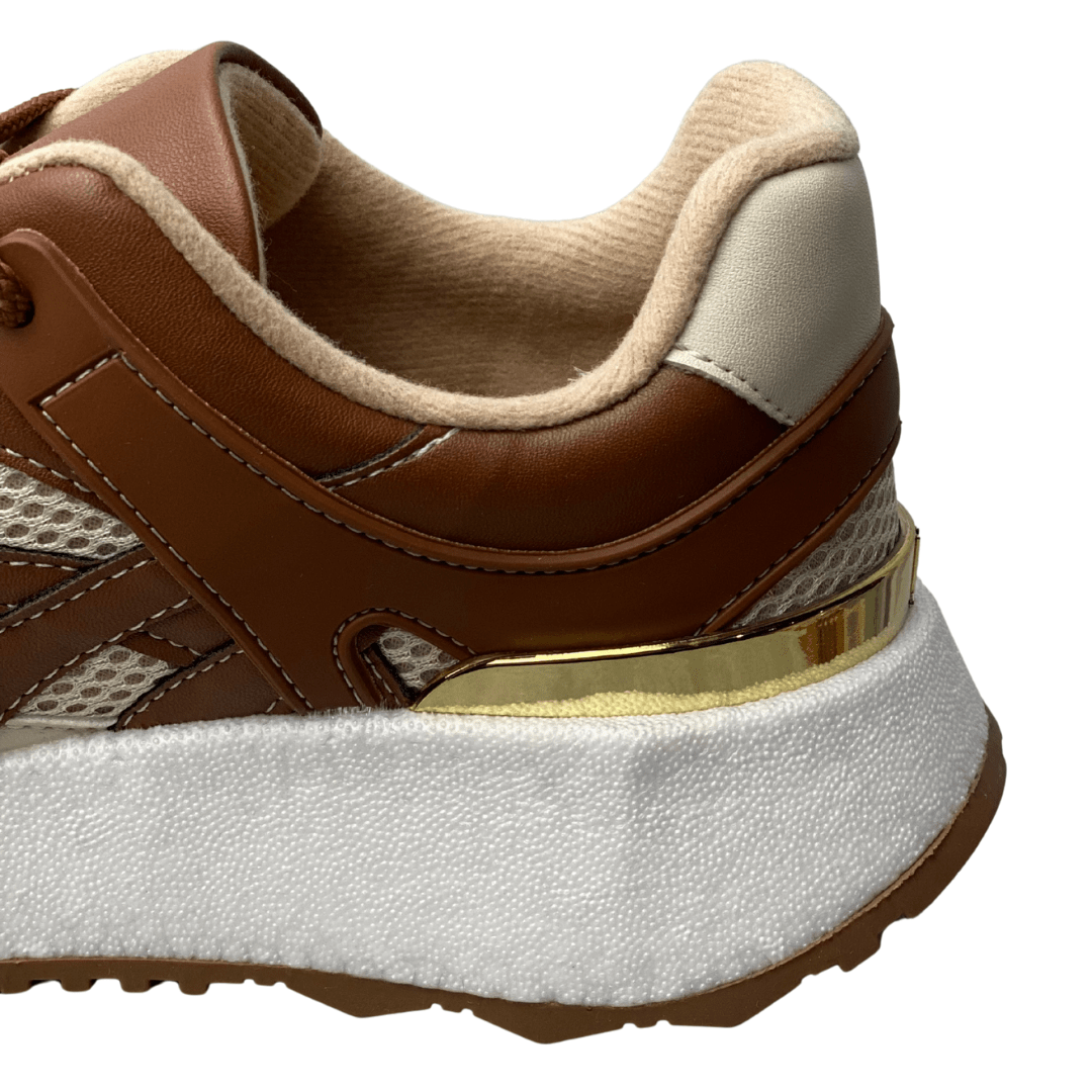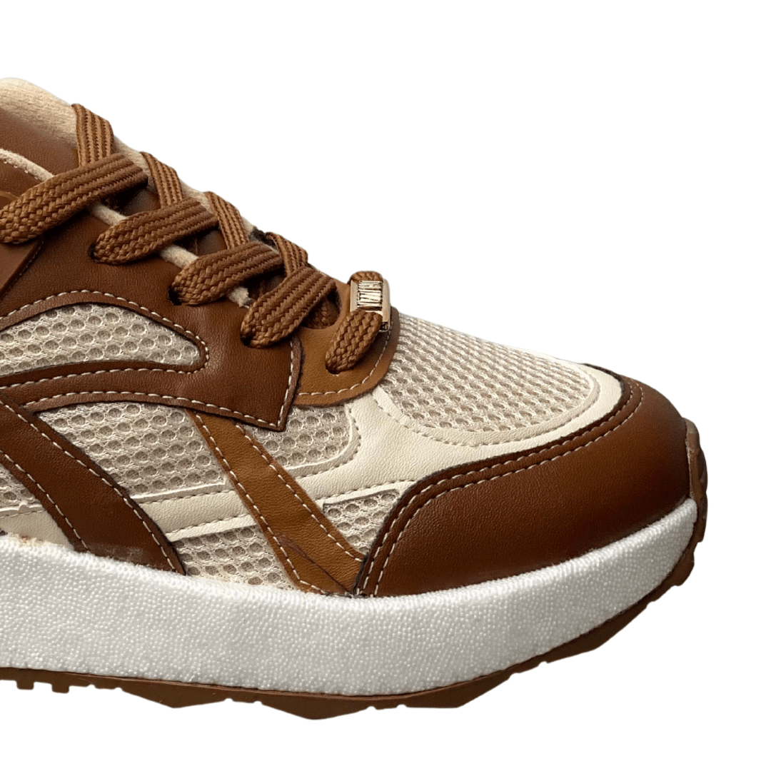 Cor: Combinação de Marrom Caramelo (recortes sintéticos), Bege/Off White (Mesh e forro) e Solado Branco. Possui detalhe metálico (dourado) no calcanhar.