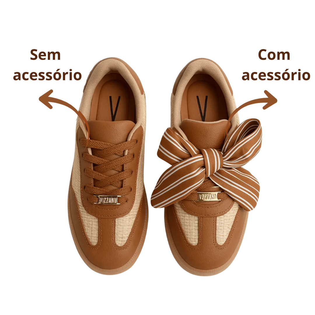 Acessório Incluso: Acompanha um laço de tecido (listrado ou xadrez em tons de Caramelo/Branco), removível, que pode ser preso sobre o cadarço.