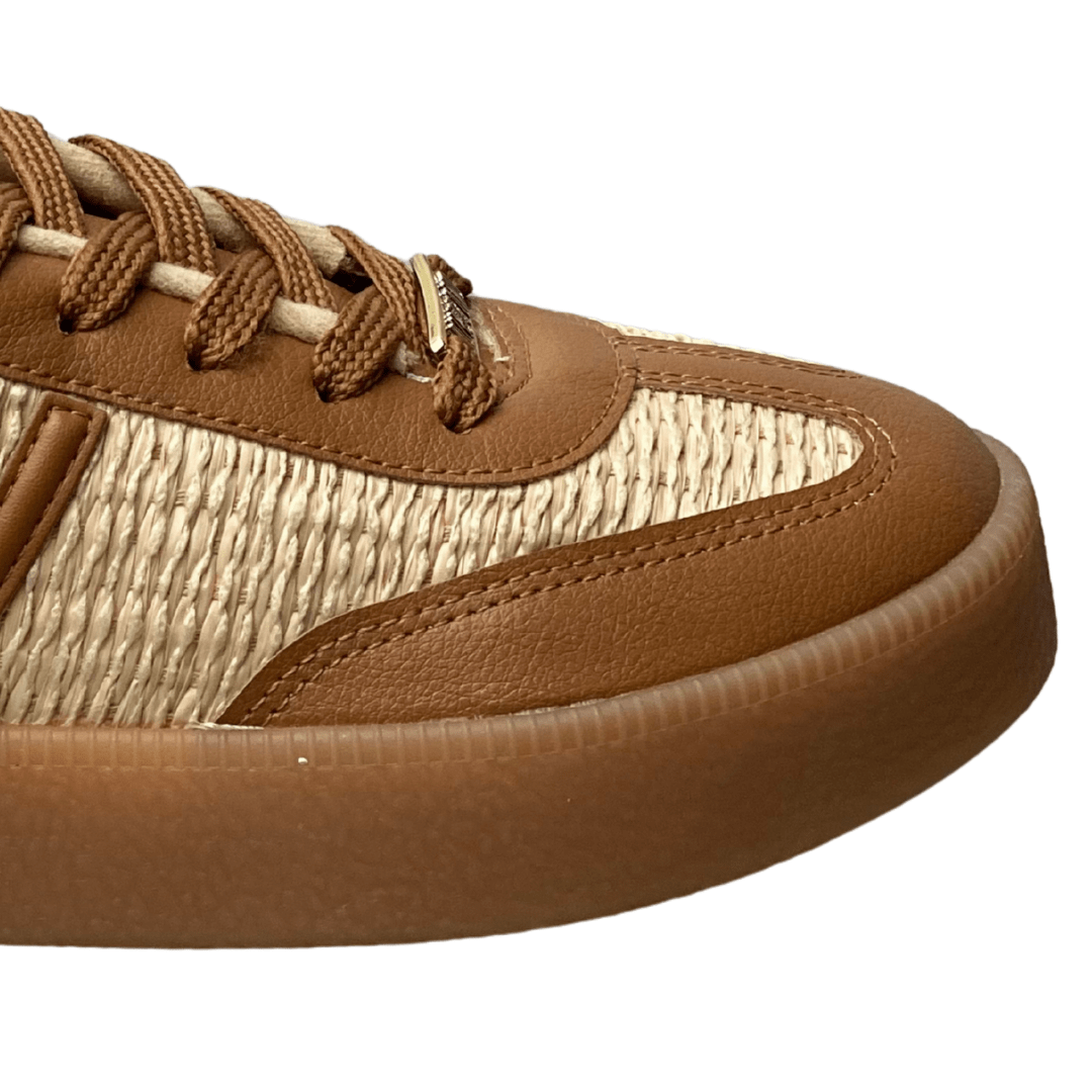 Cabedal: Confeccionado em material sintético liso (Caramelo) e material texturizado (imitação de palha/tressê) na cor Natural.