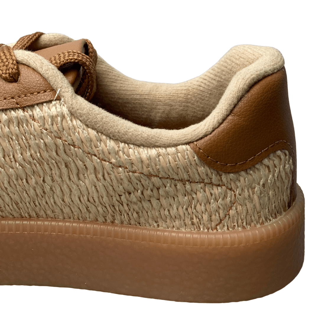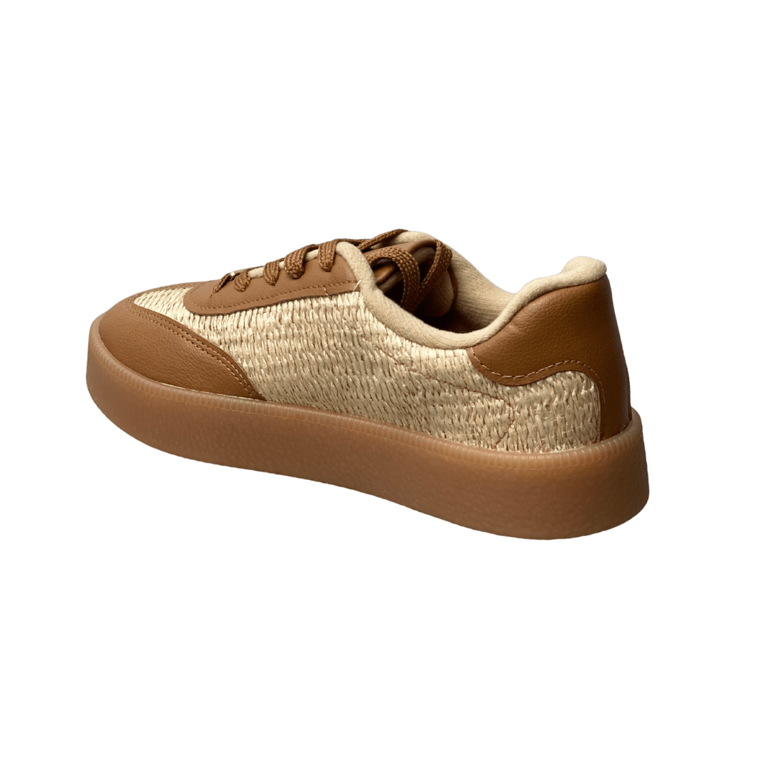 Estilo Trendy e Texturizado: A aplicação de material com textura que imita palha ou tressê no cabedal confere um toque artesanal, de verão e muito elegante ao tênis.