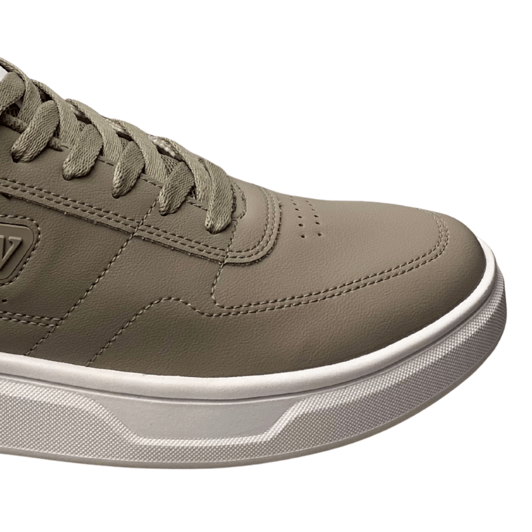 Cabedal: Material sintético ou couro liso na cor Moon Rock (Cáqui/Cinza-Bege Escuro).
