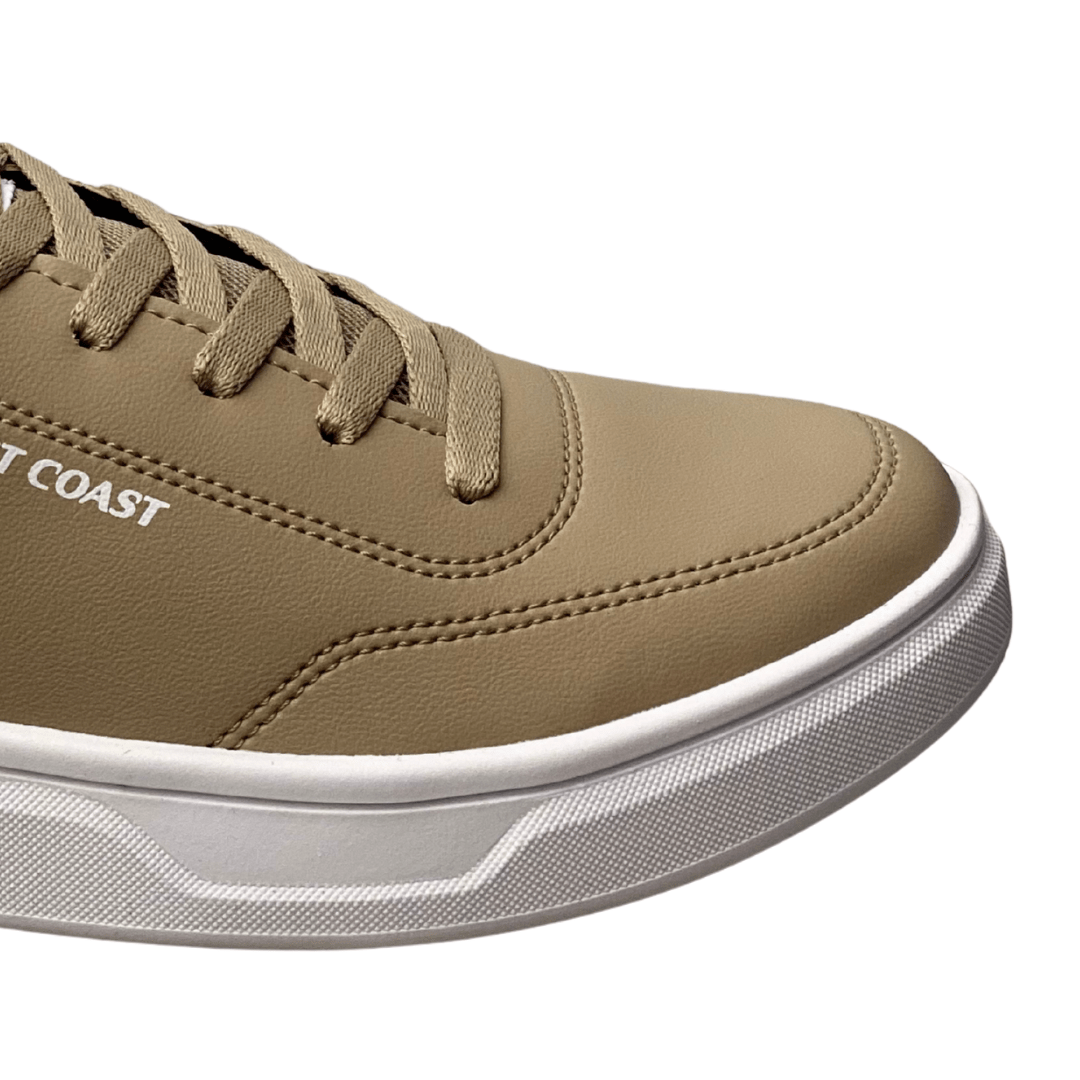 Cabedal: Material sintético ou couro liso na cor Sand/Cáqui/Bege Claro.