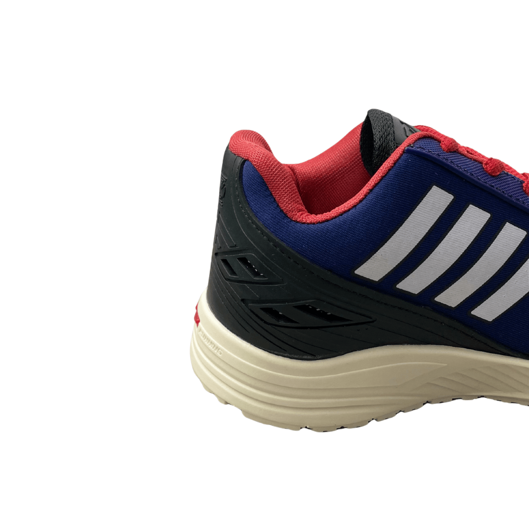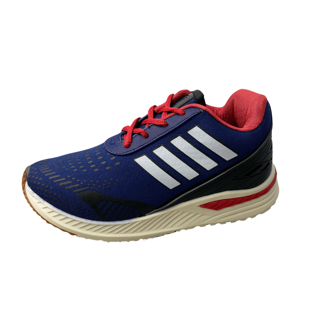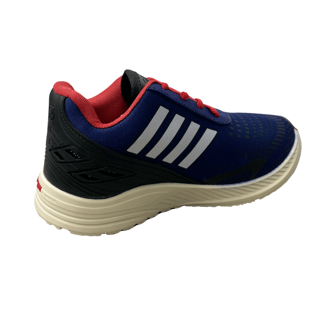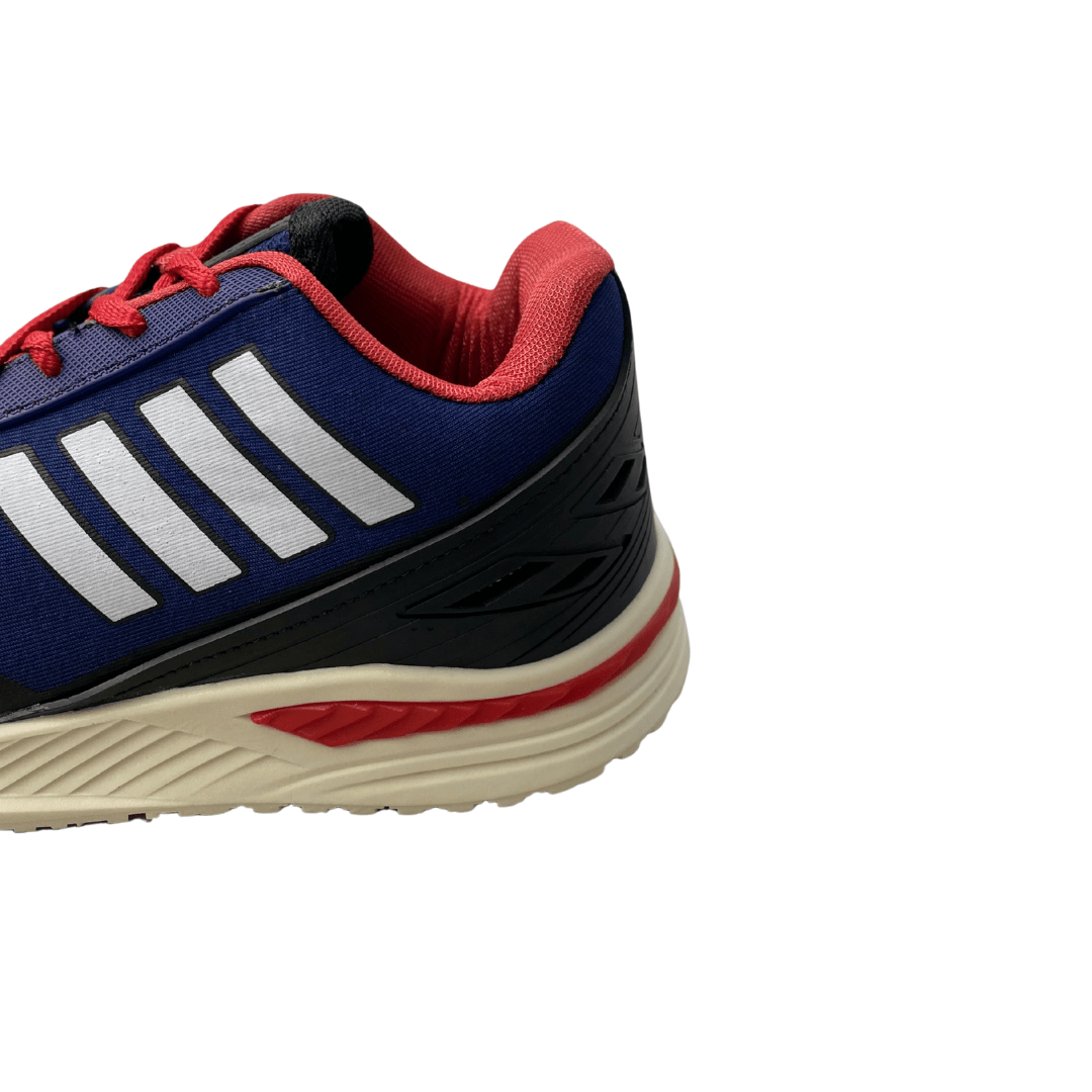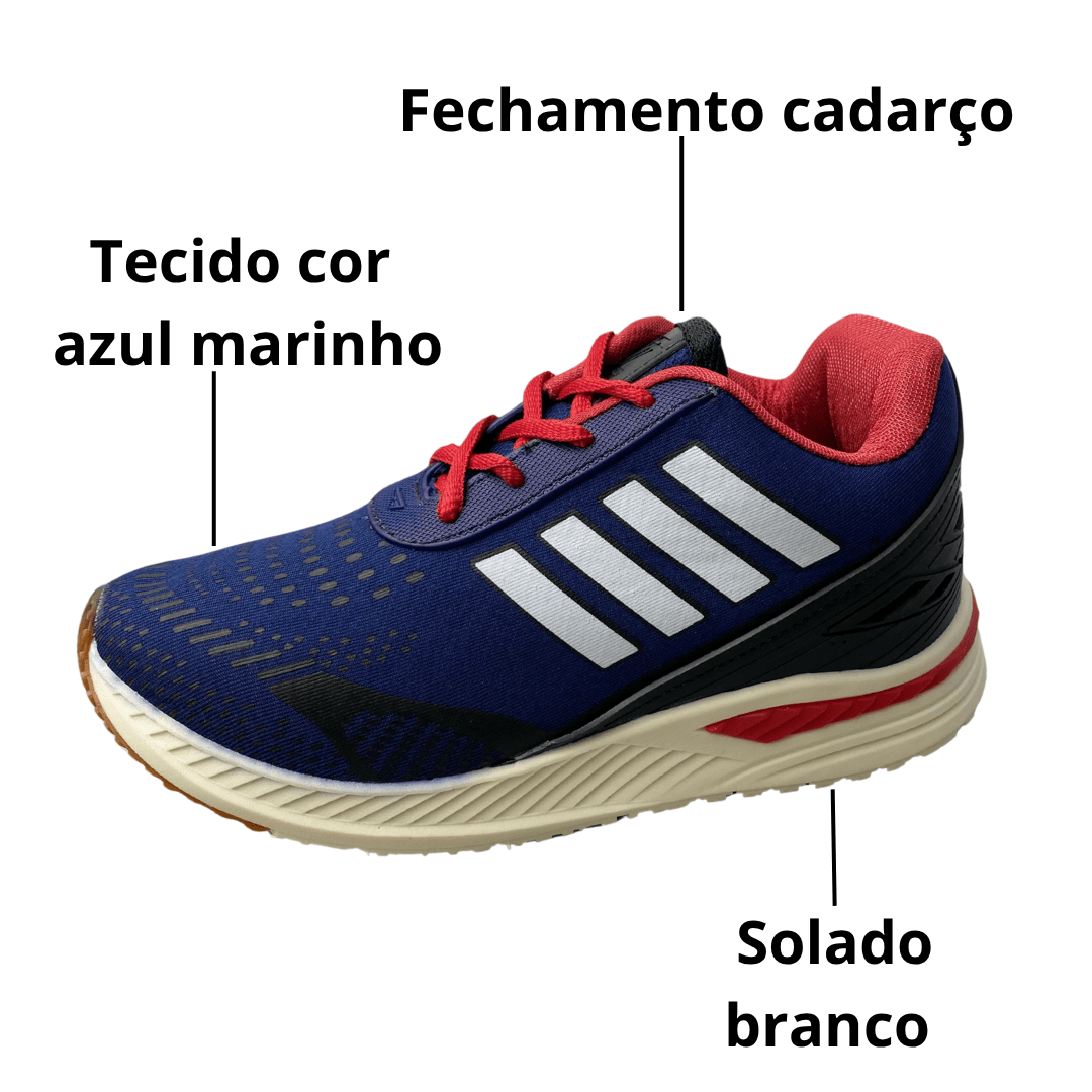 Cor: azul marinho com detalhes em vermelho, branco e preto.