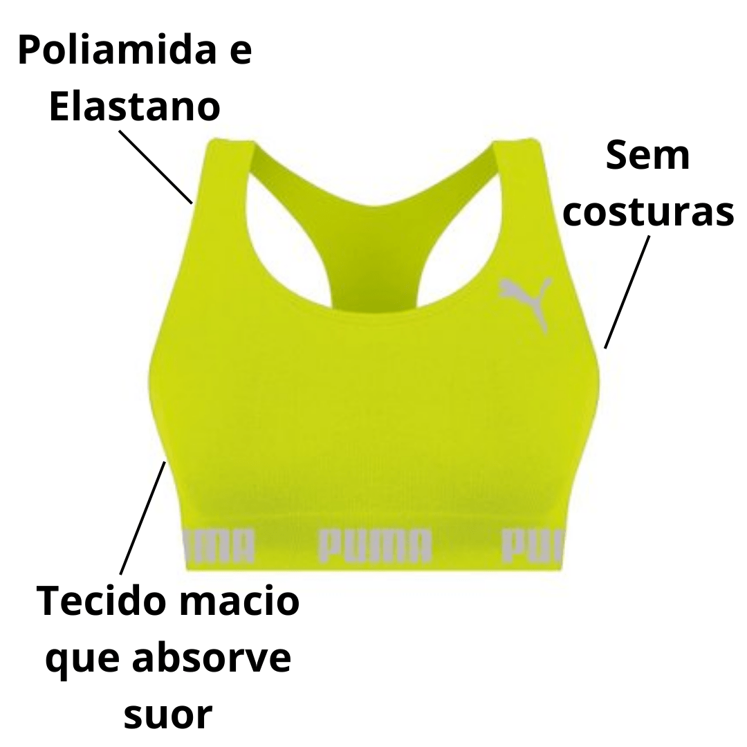 Top sem costuras com costas em Y para conforto e liberdade de movimentos e elástico de 40mm com logo PUMA, sem bojo e proporciona um ajuste confortável enquanto você se exercita. Tecido macio que absorve suor, para te manter seca e segura durante suas atividades.